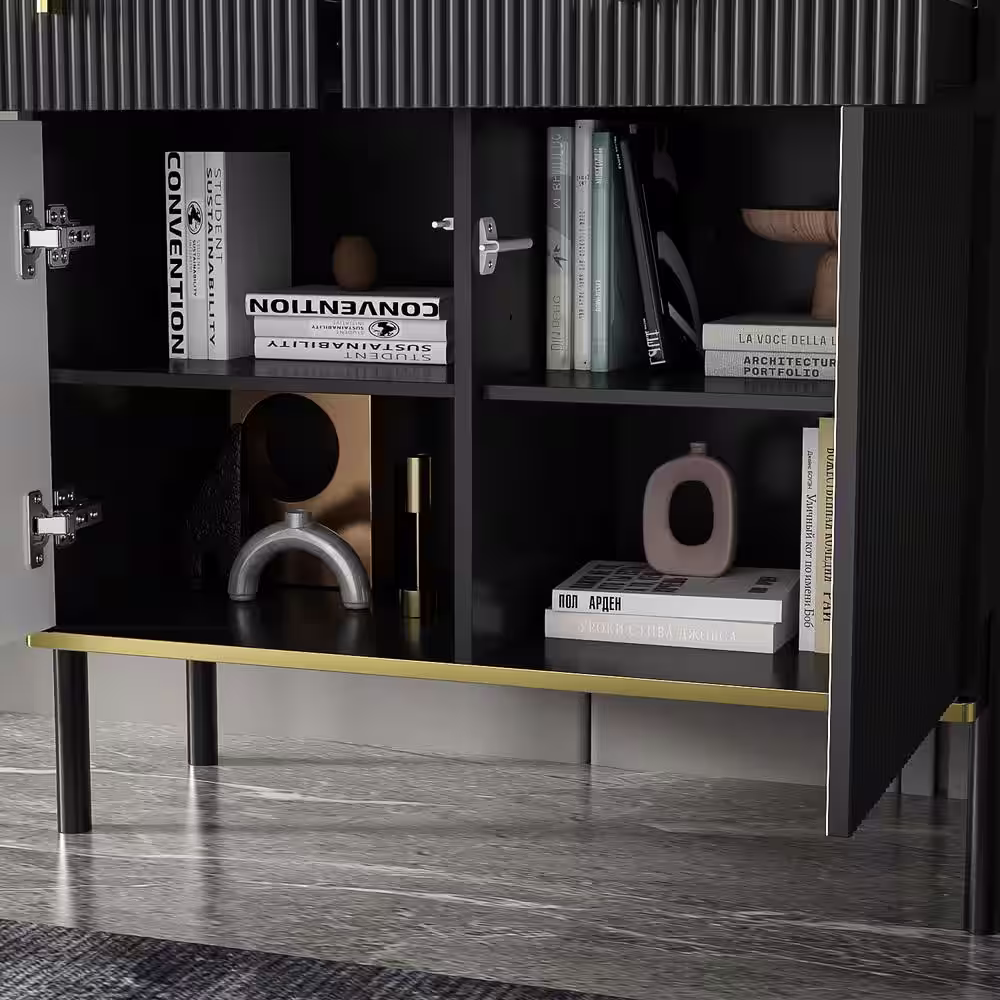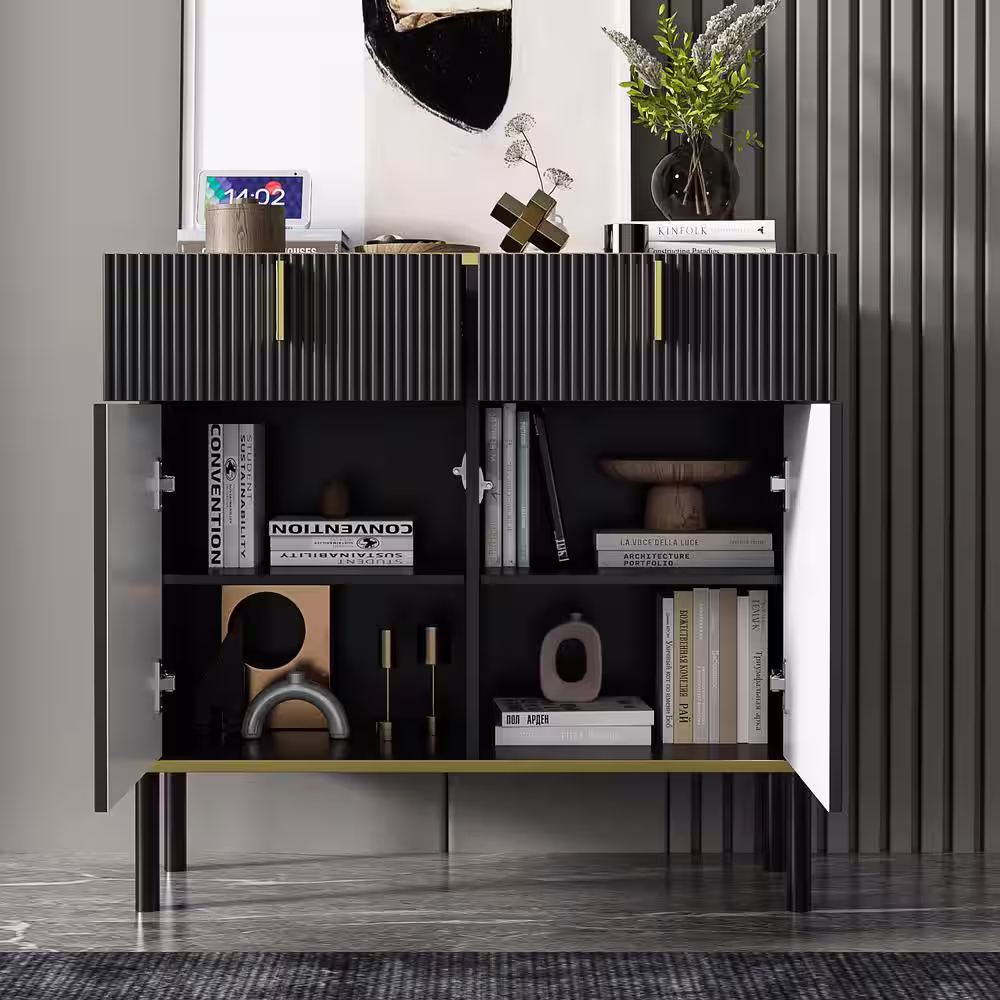 FUFU&GAGA Black Wooden Accent Storage Cabinet, Sideboard with 2-Drawers, 2 Doors, 4 Doors and Vertical Wavy Front Surface