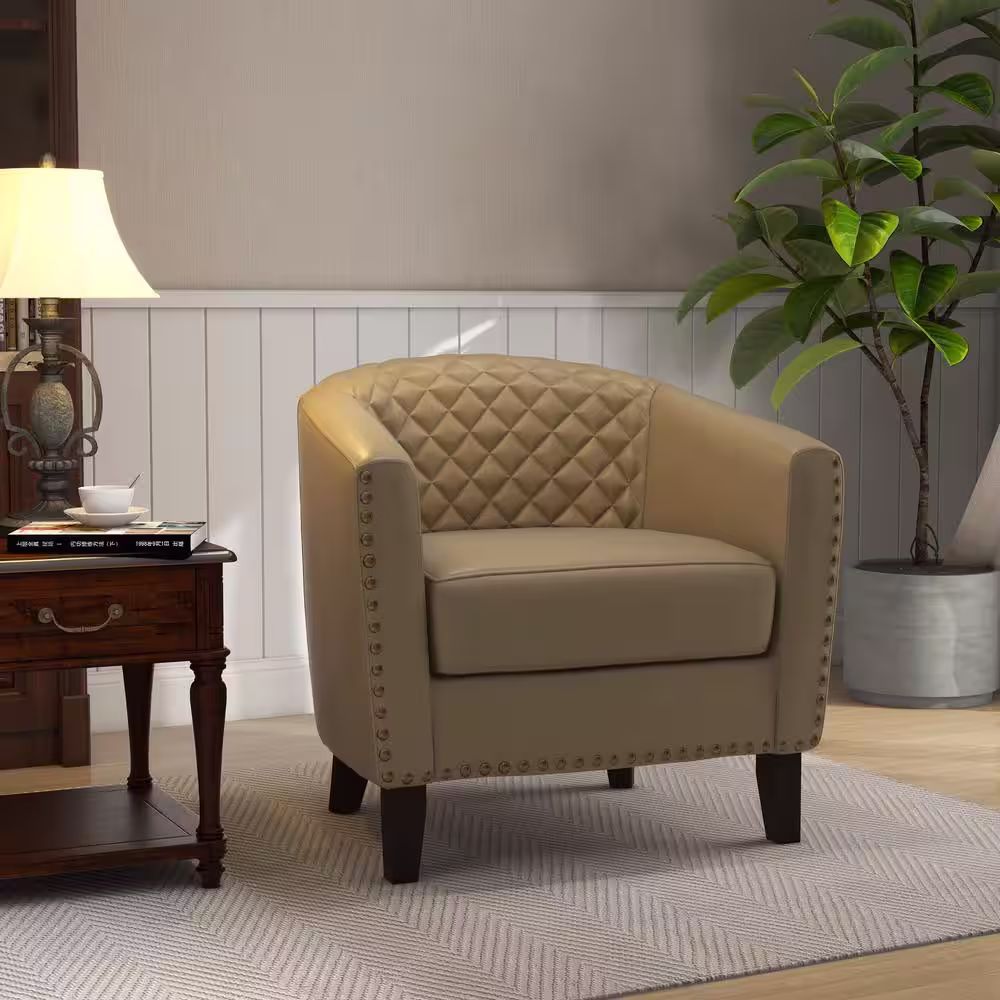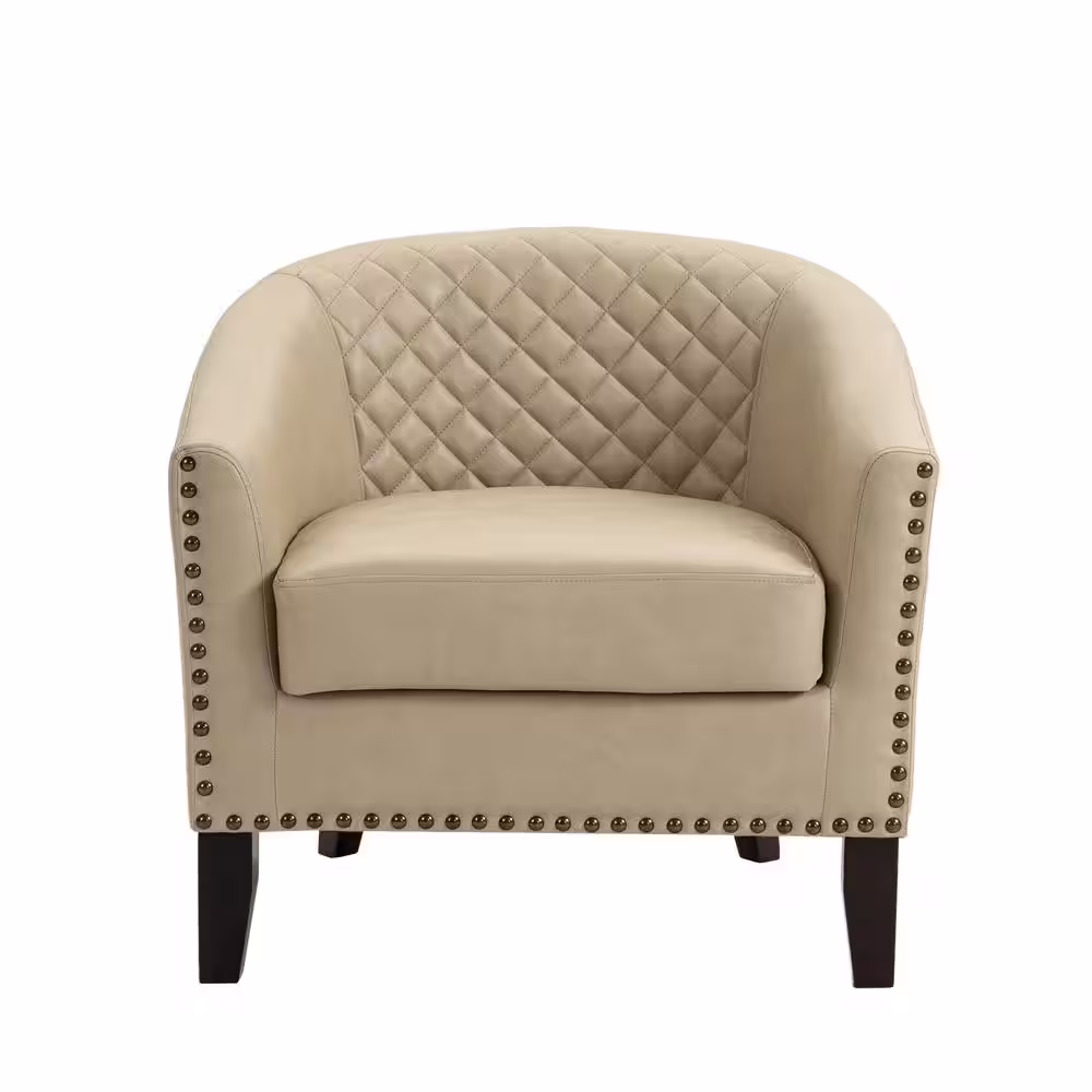 None Modern Beige Solid Wood Legs PU Leather Upholstered Accent Barrel Chair With Nailhead Trim