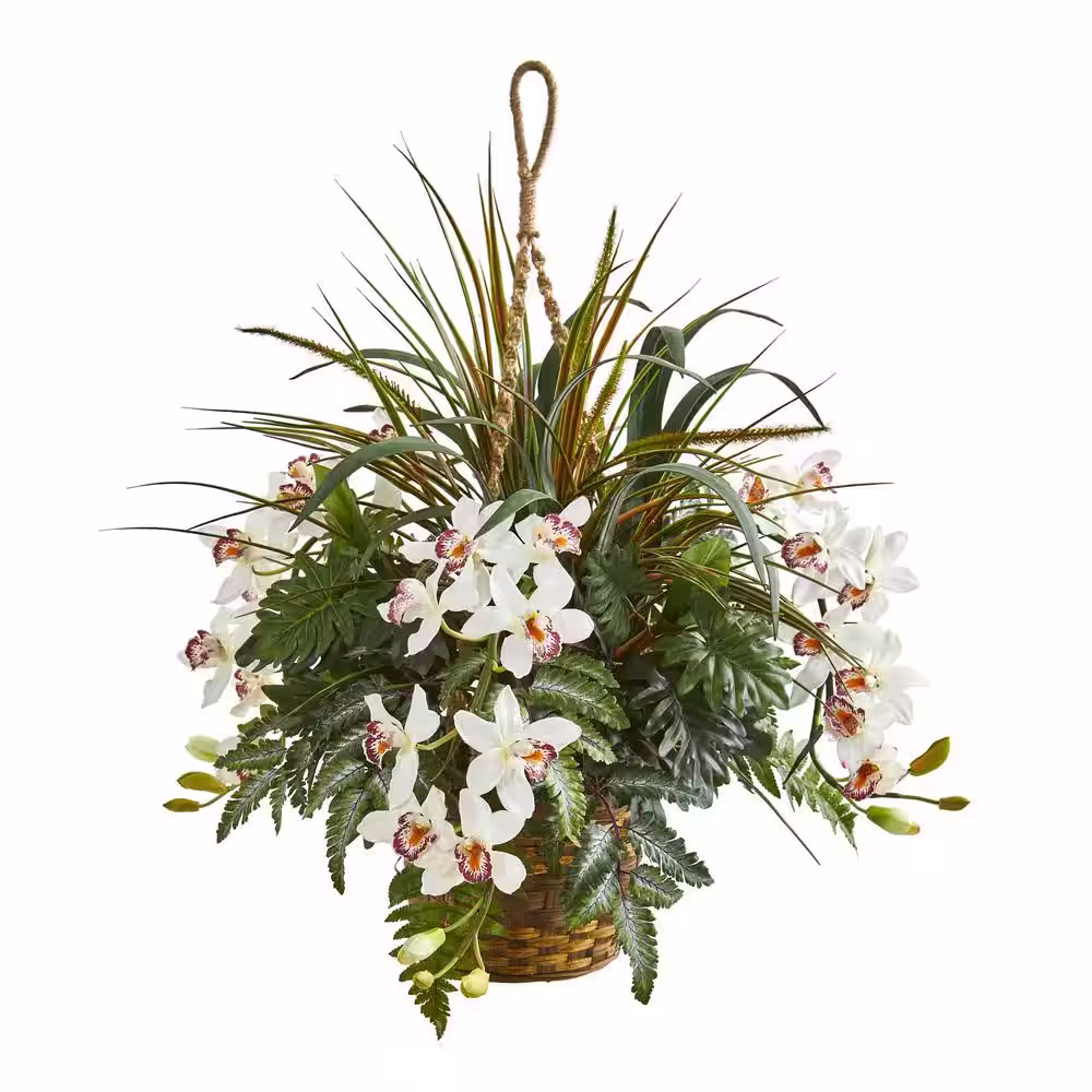 Nearly Natural 29 in. Indoor Cymbidium Orchid and Mixed Greens Artificial Plant Hanging Basket