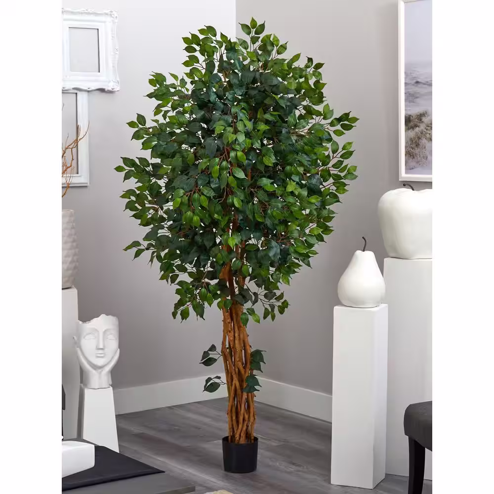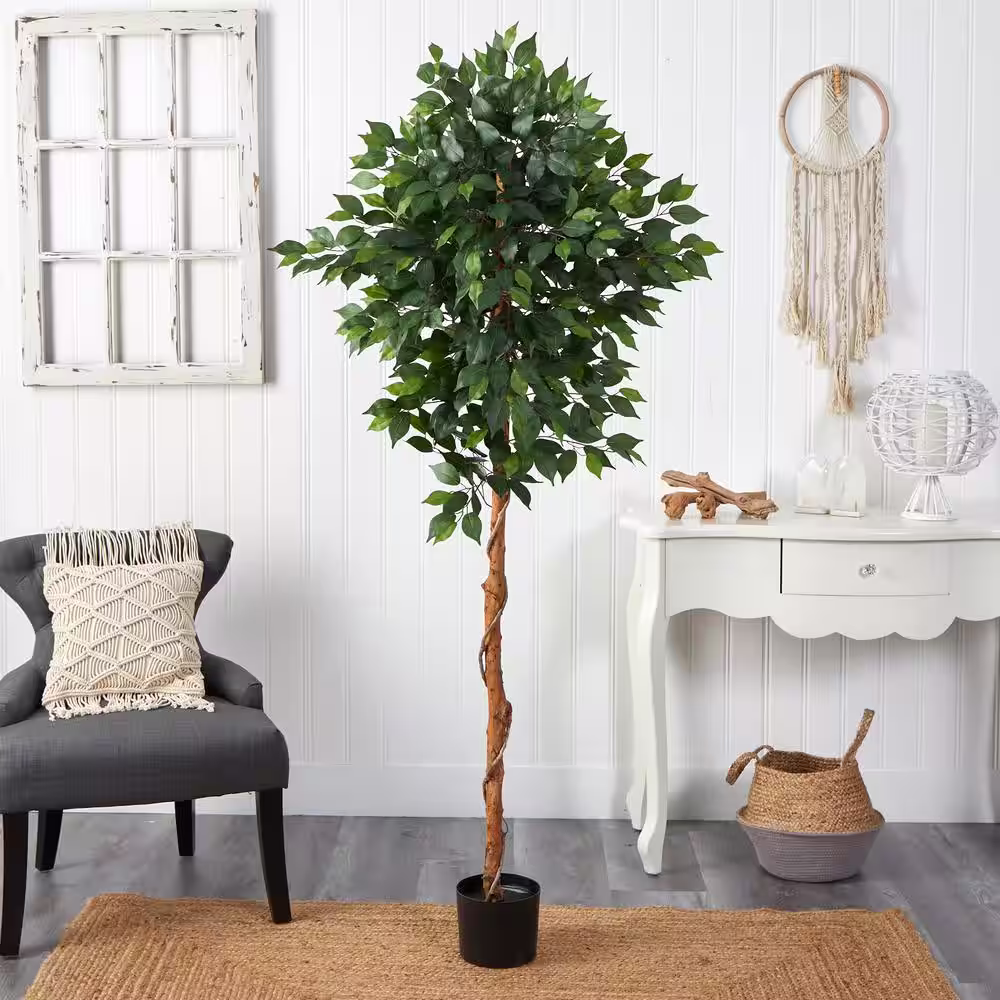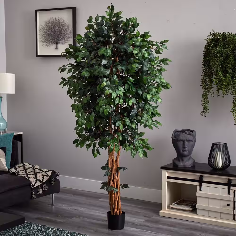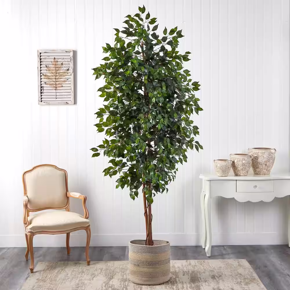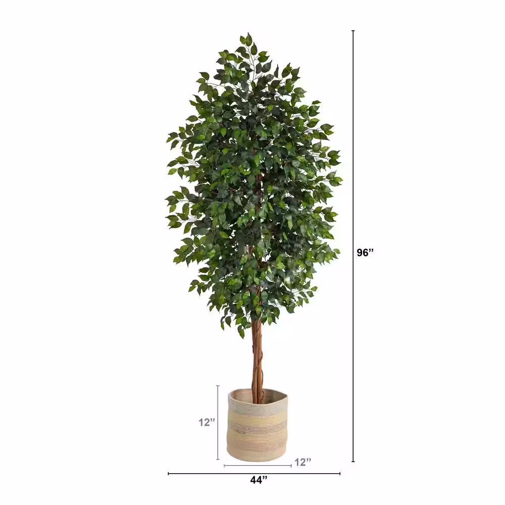 Nearly Natural 8 ft. Green Ficus Artificial Tree with Handmade Natural Cotton Multicolored Woven Planter