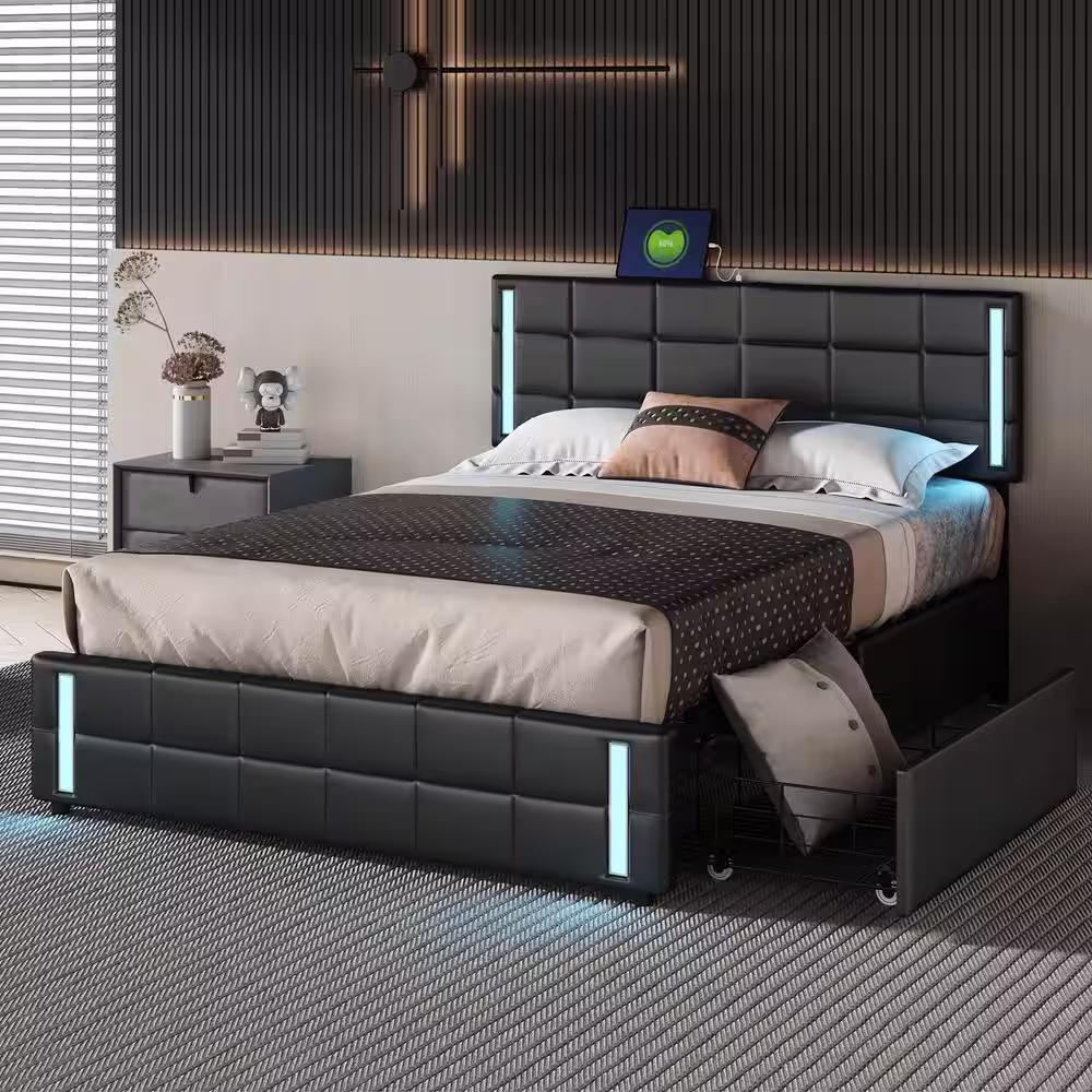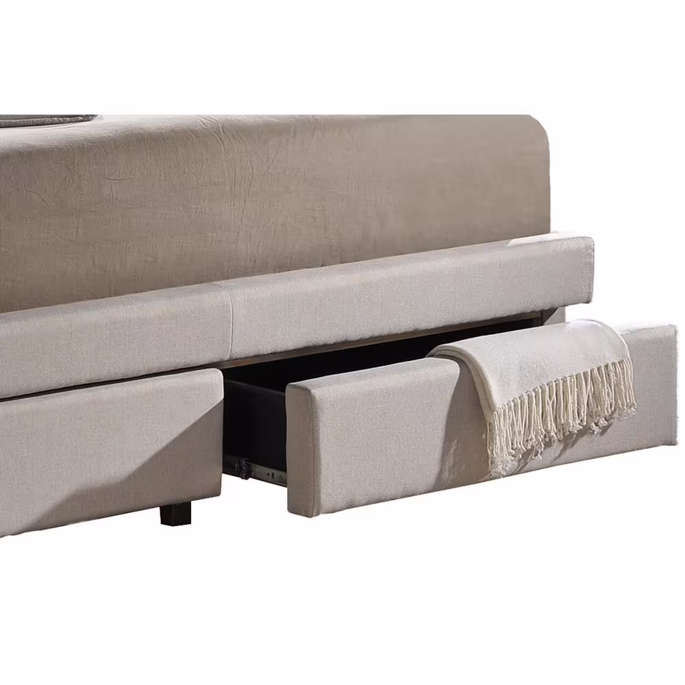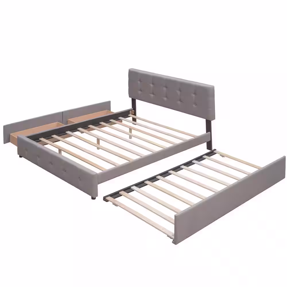 Qualler Light Gray Wood Frame Queen Upholstered Platform Bed with 2-Drawers and 1-Twin XL Trundle