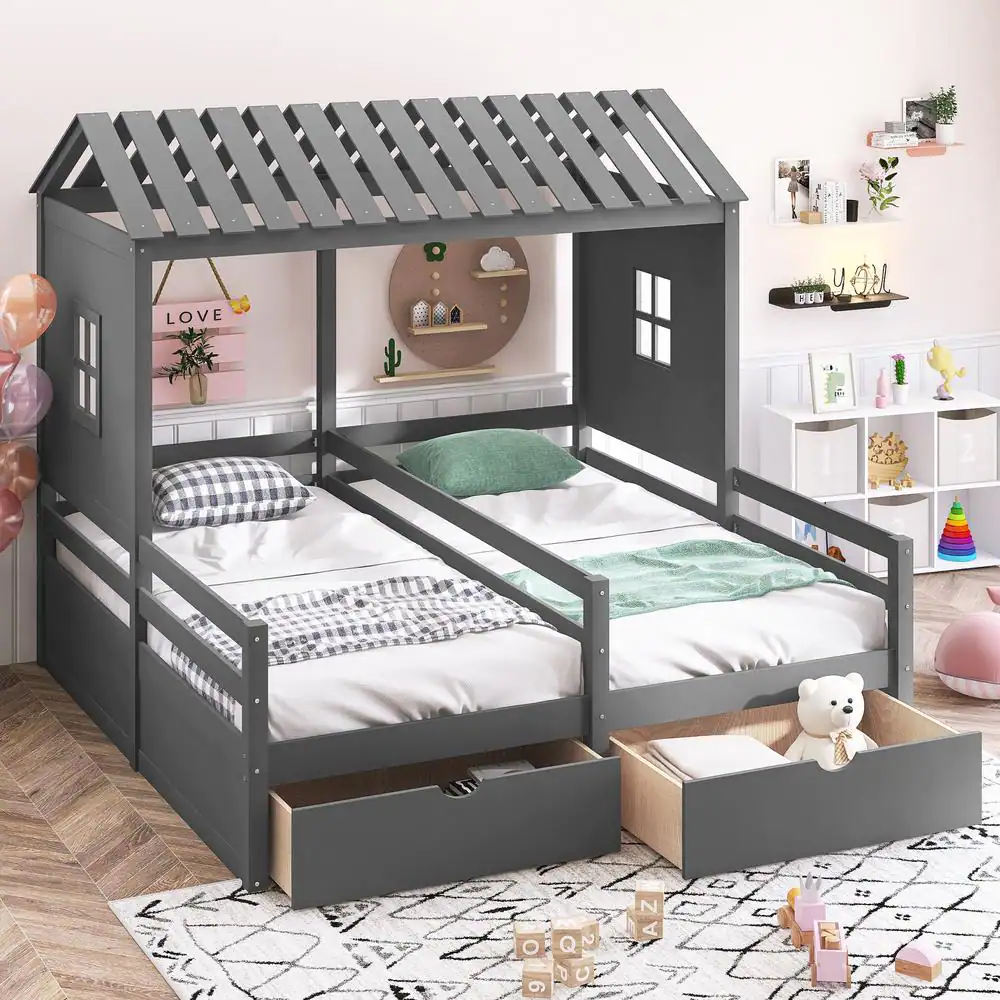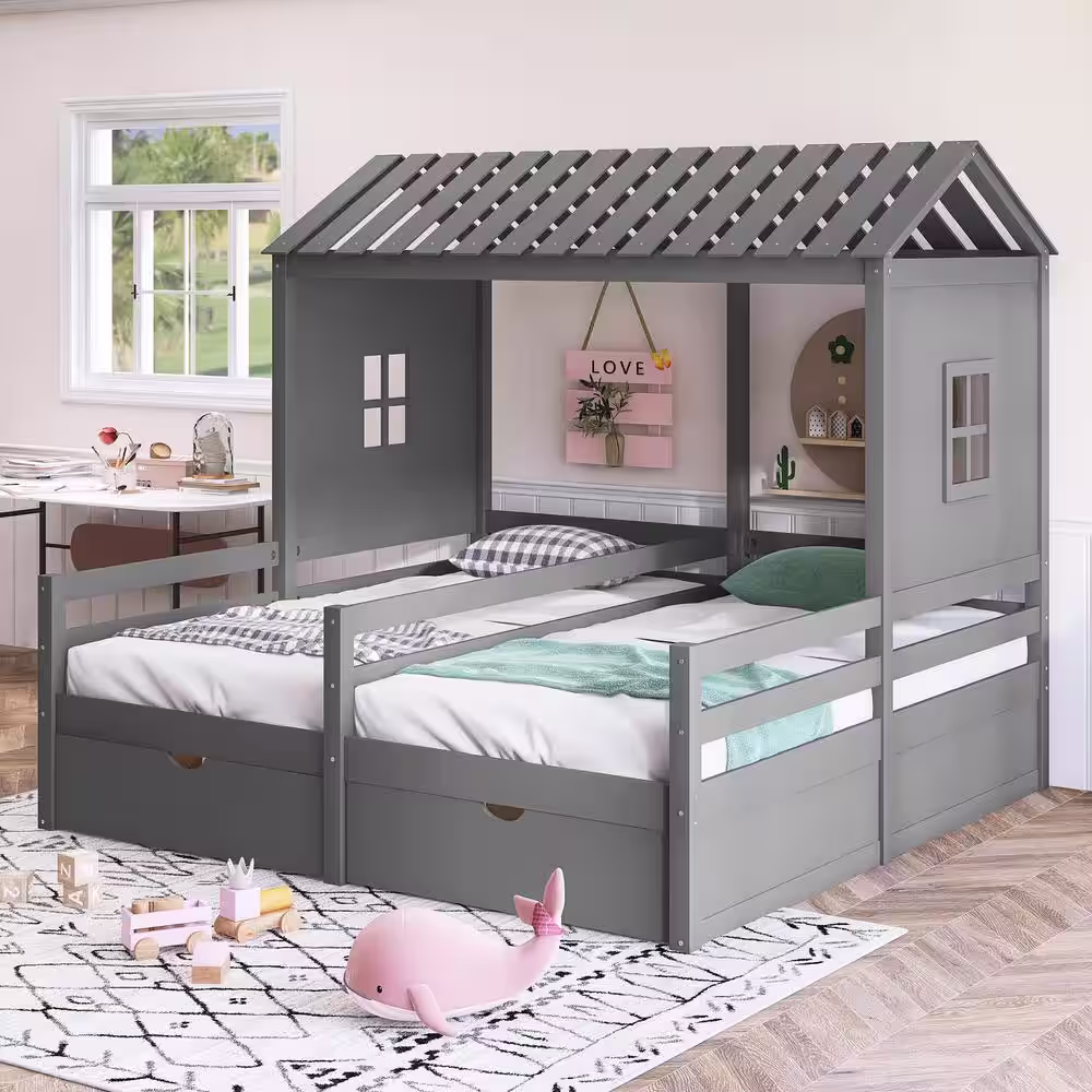 Harper & Bright Designs 77.3 in. W Gray Twin Size Wood Frame Combination of 2 Side by Side Platform Bed