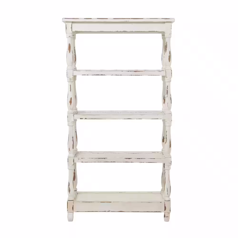 Litton Lane 5 Shelf Wood Stationary White Distressed Open Shelving Unit with Spindle Sides and Mesh