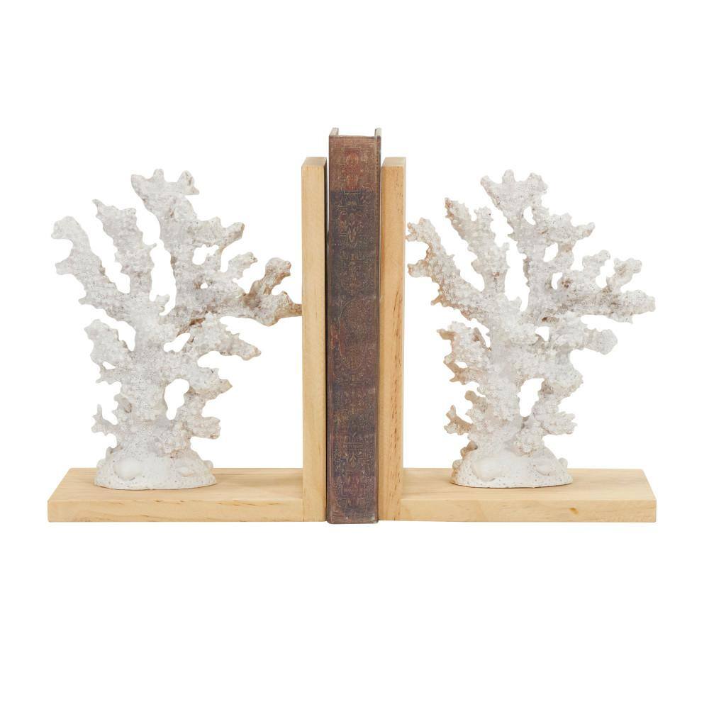 Litton Lane White Resin Textured Coral Bookends with Brown L-Shaped Stands (Set of 2)