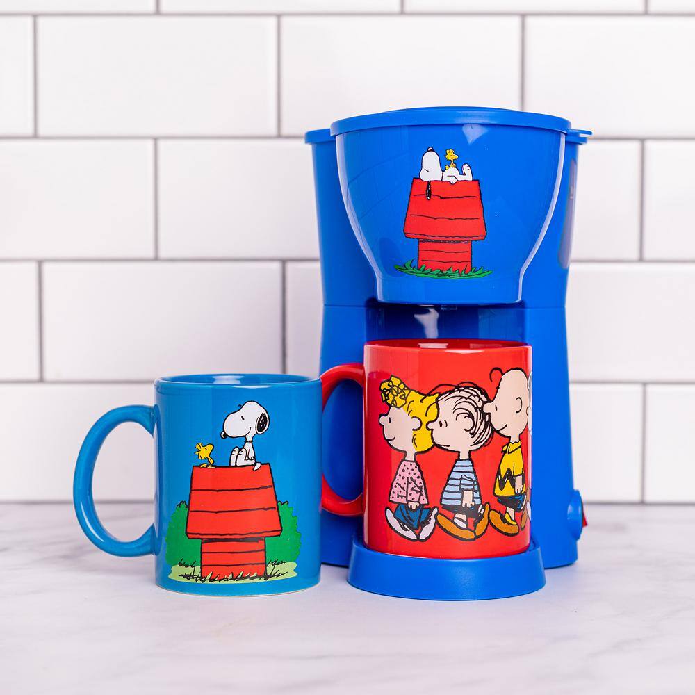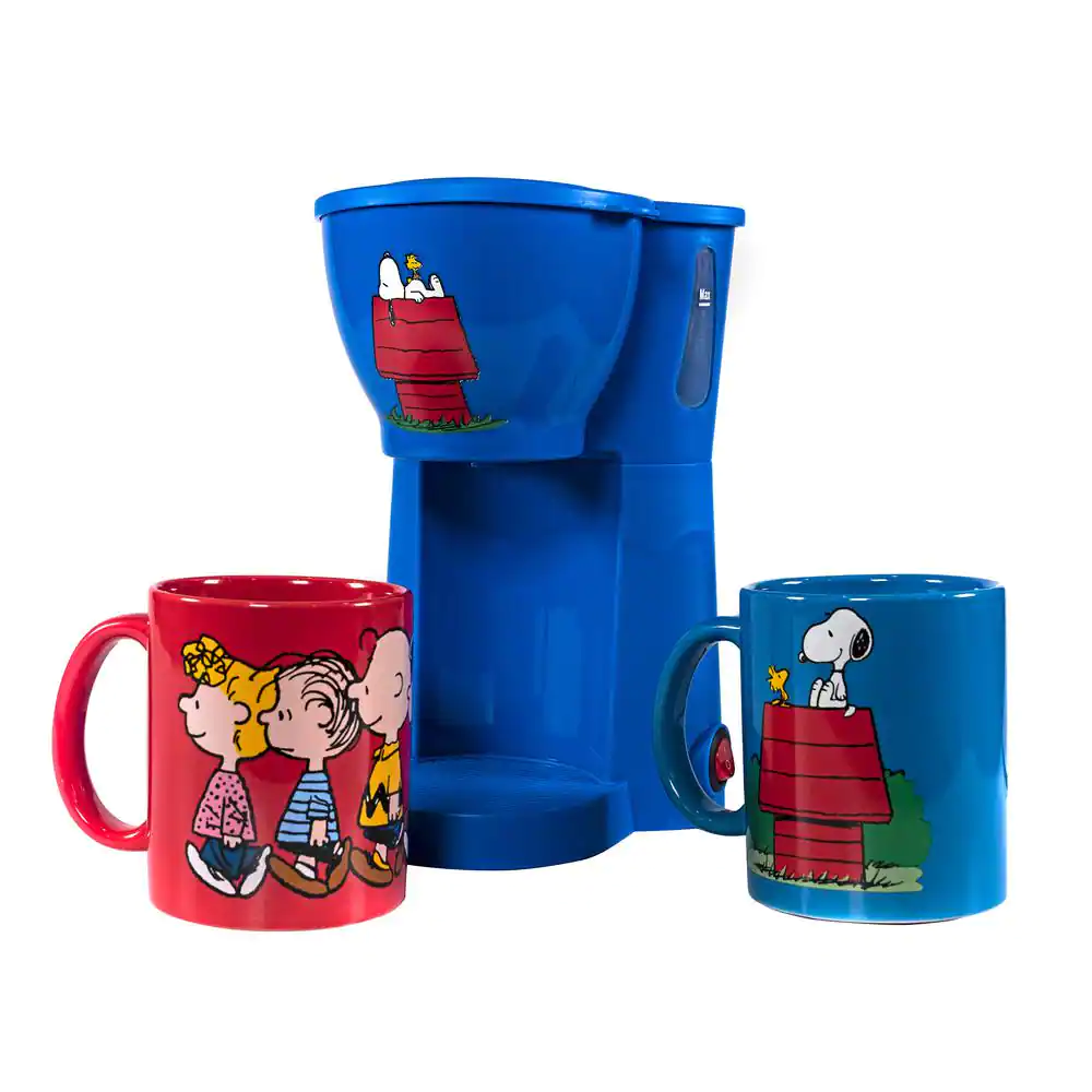 Uncanny Brands Peanuts Single Cup Black Drip Coffee Maker Snoopy and Friends Mugs Included