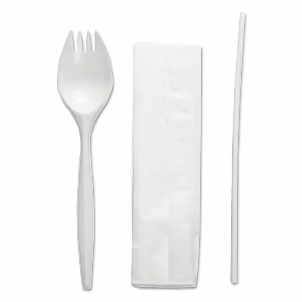 Boardwalk White Disposable Polypropylene Utensils, School Cutlery Kit, Napkin/Spork/Straw, White (1000-Carton)