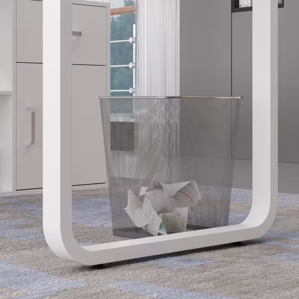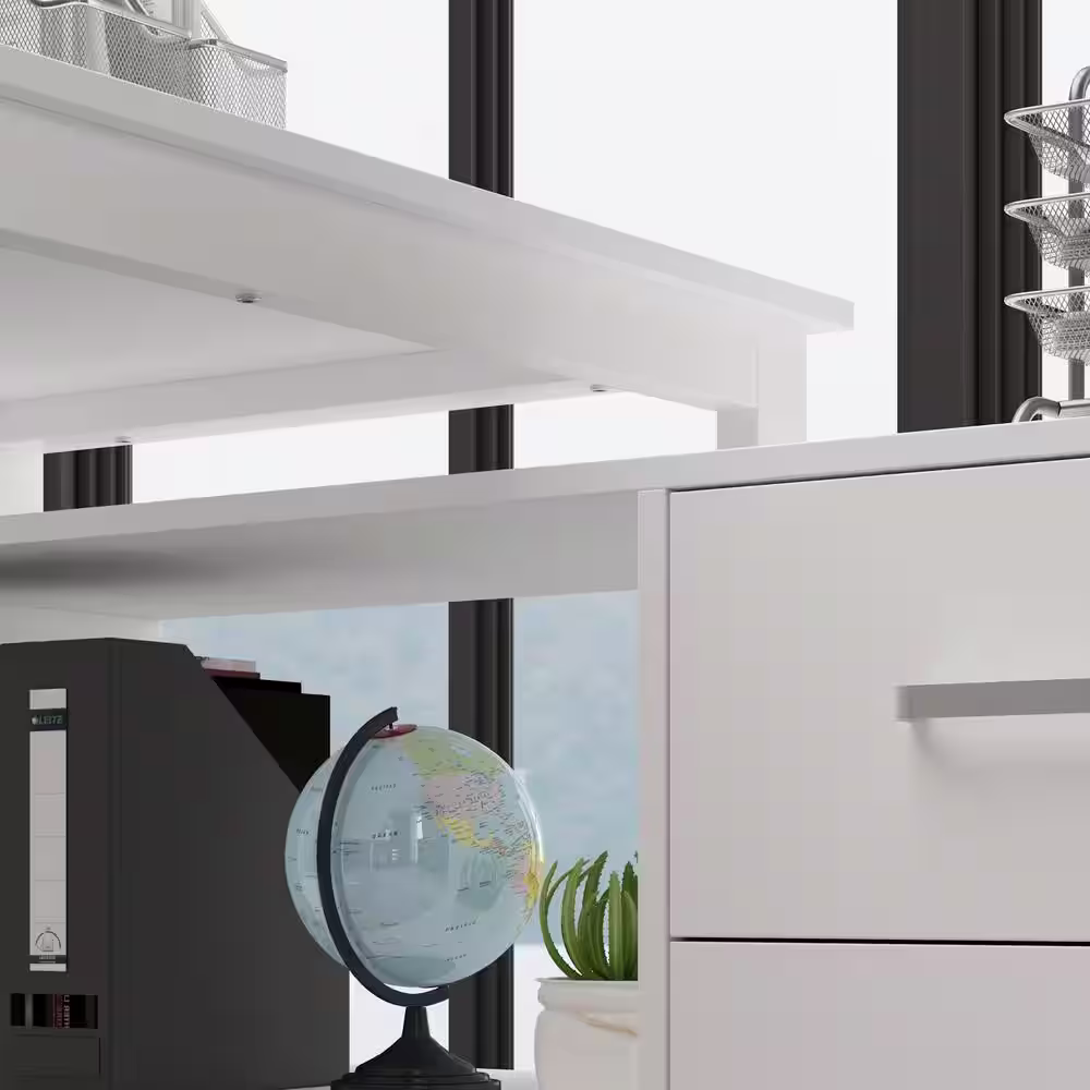None L-Shaped White Wooden Commercial Writing Desk, with 1 Drawer, Open Shelves and Eco-Friendly Paint Finish, 55.1 in. W