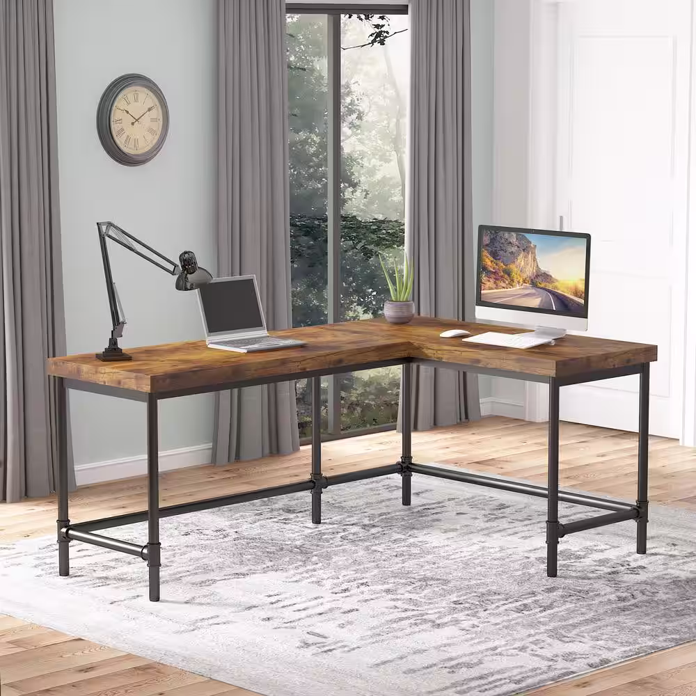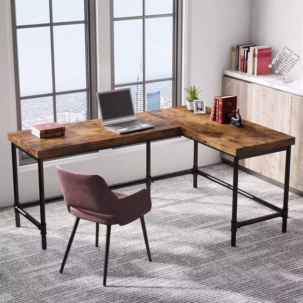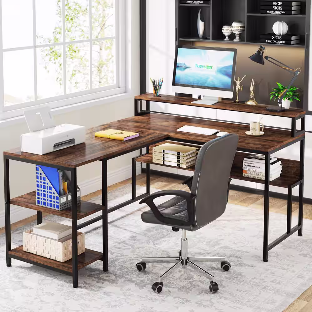 None Perry 59 in. L-Shaped Rustic Brown Wood Computer Desk with Storage Shelves