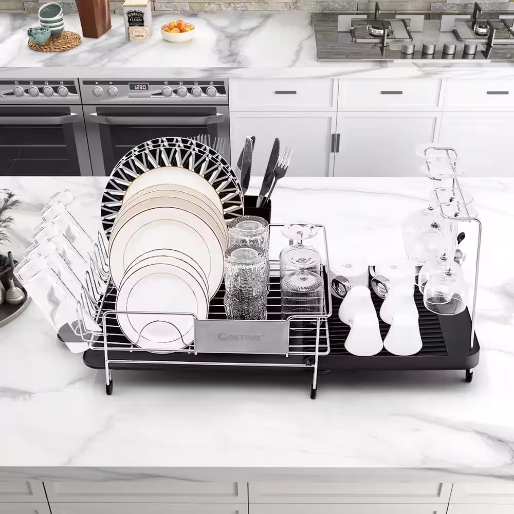Costway Dark Grey Aluminum Expandable Drying Dish Rack w/Drainboard & Rotatable Drainage Spout
