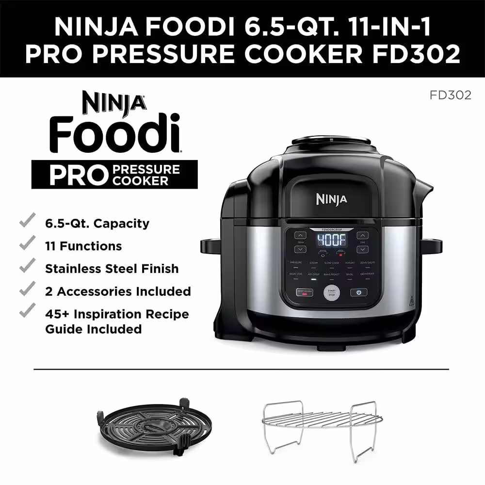 NINJA 6.5 qt. Electric Stainless Steel Pro Pressure Cooker + Air Fryer with Nesting Broil Rack