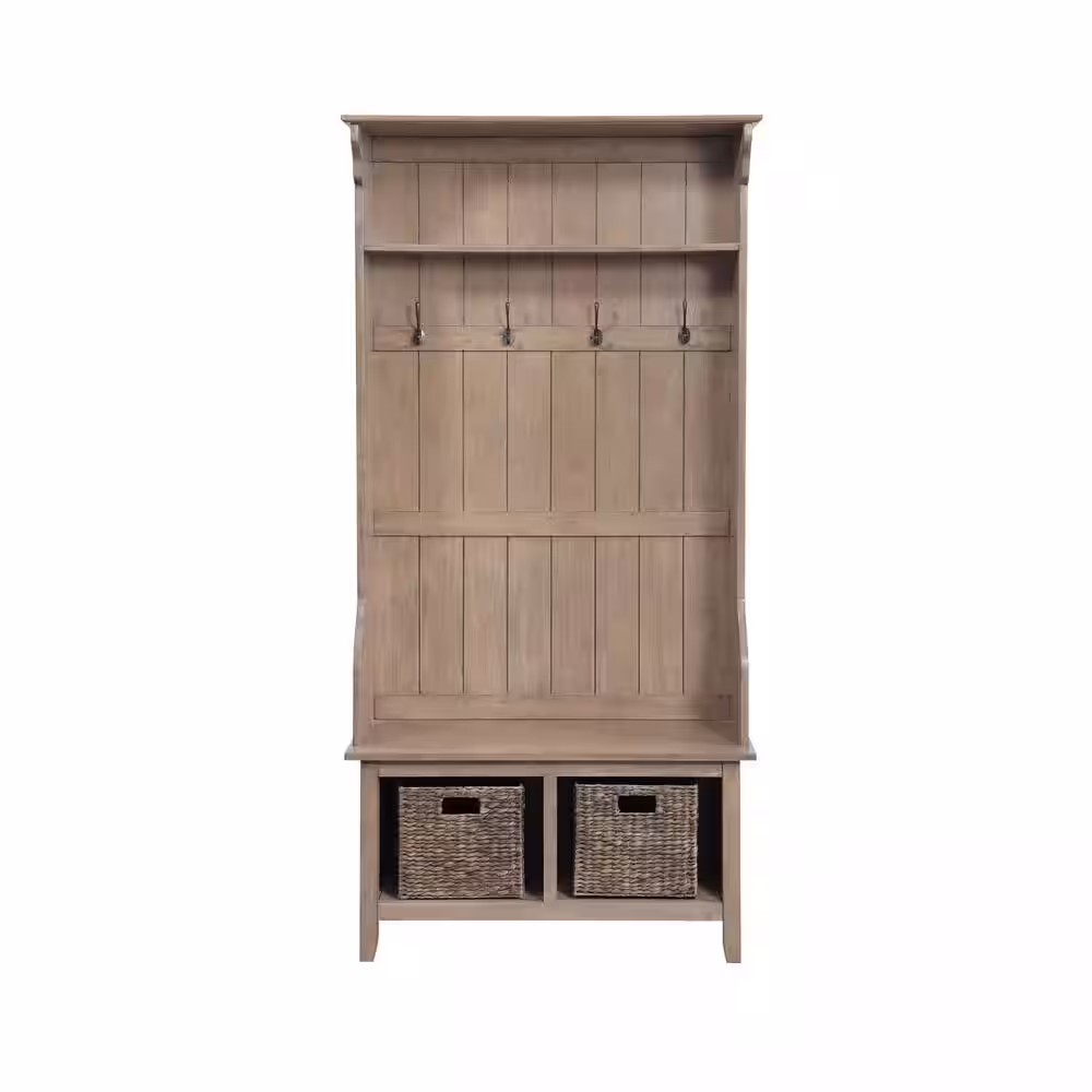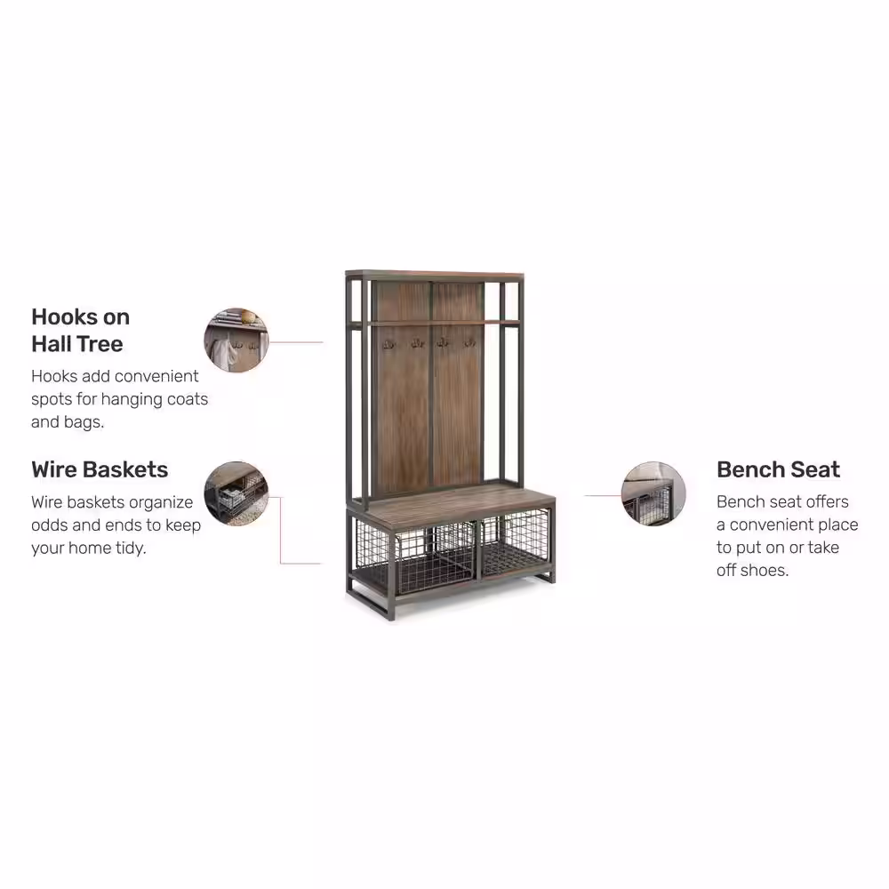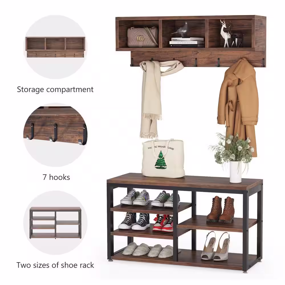 None Howard Coffee Wood 32 in. Shoe Rack with Coat Hooks, Hall Tree with Shoe Bench and Shelves