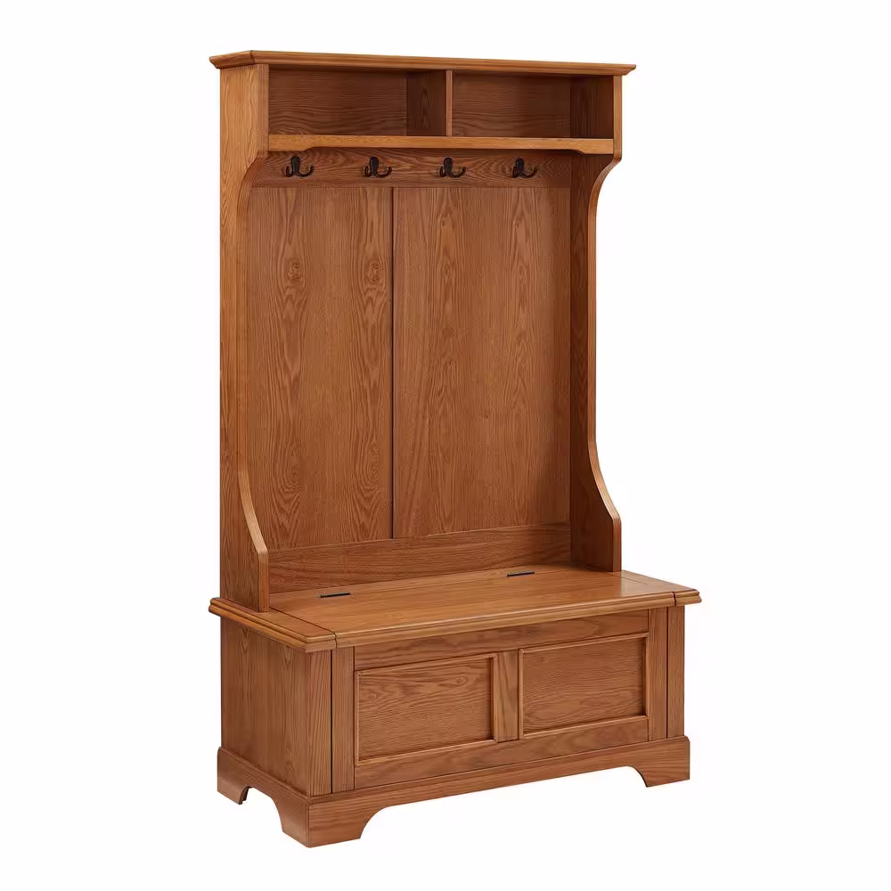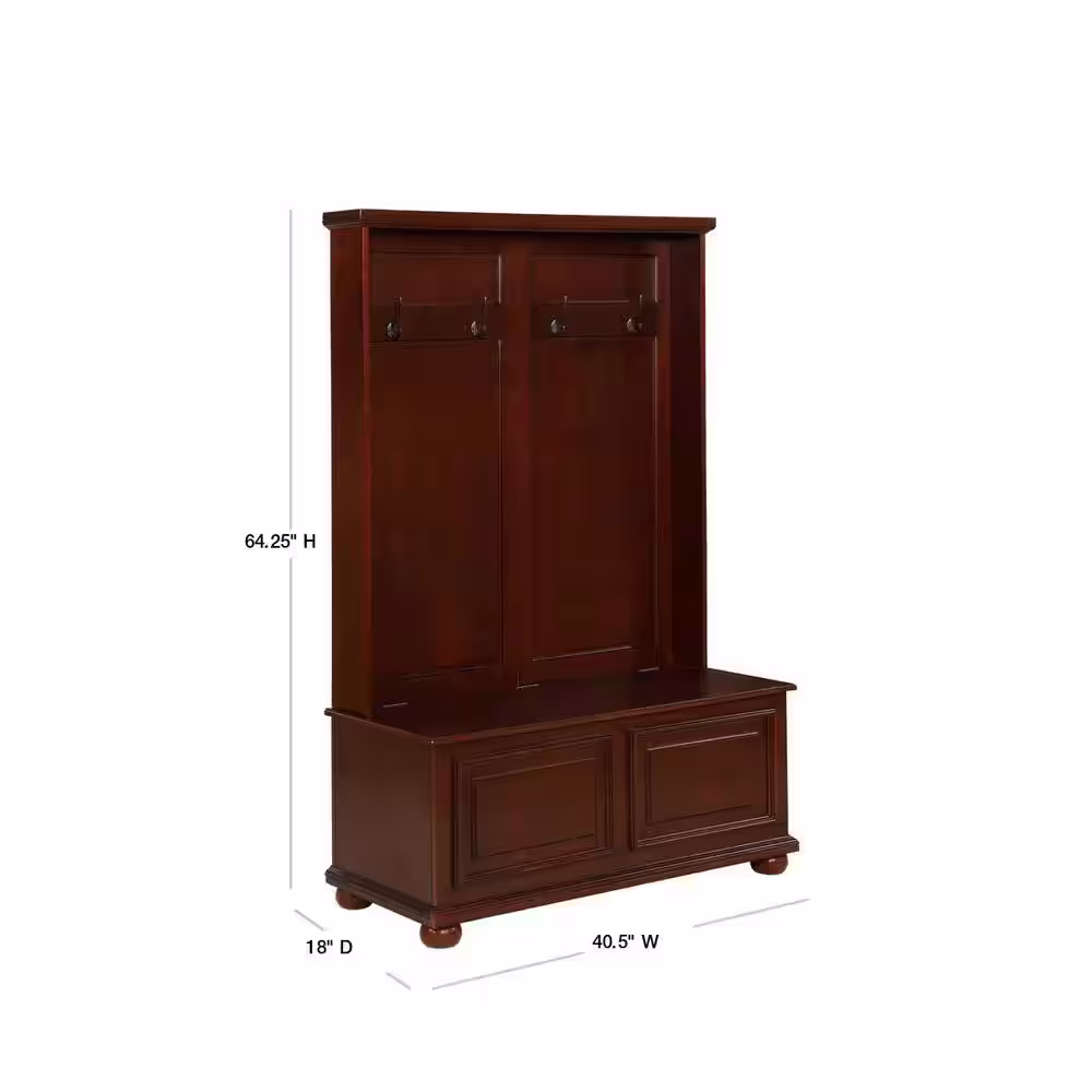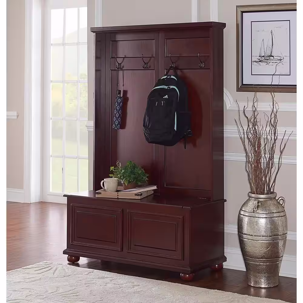Powell Company Rockland Cherry Finish Hall Tree with Four Mounted Hooks and Storage