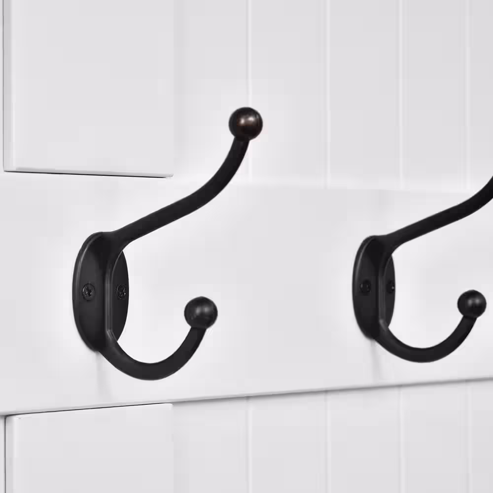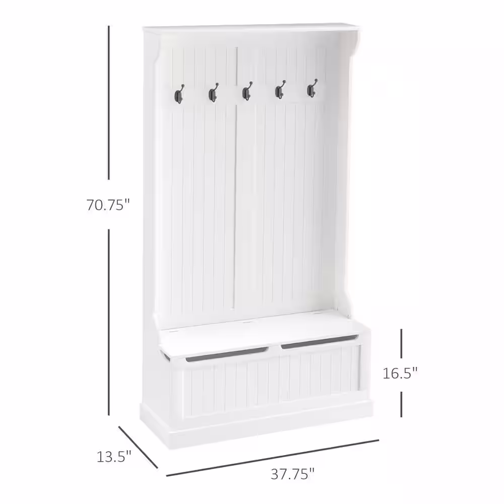 HOMCOM White Hall Tree Storage Bench and Coat Rack with 5 Steel Double Hooks and Anti-Topple Anchor for Entryway