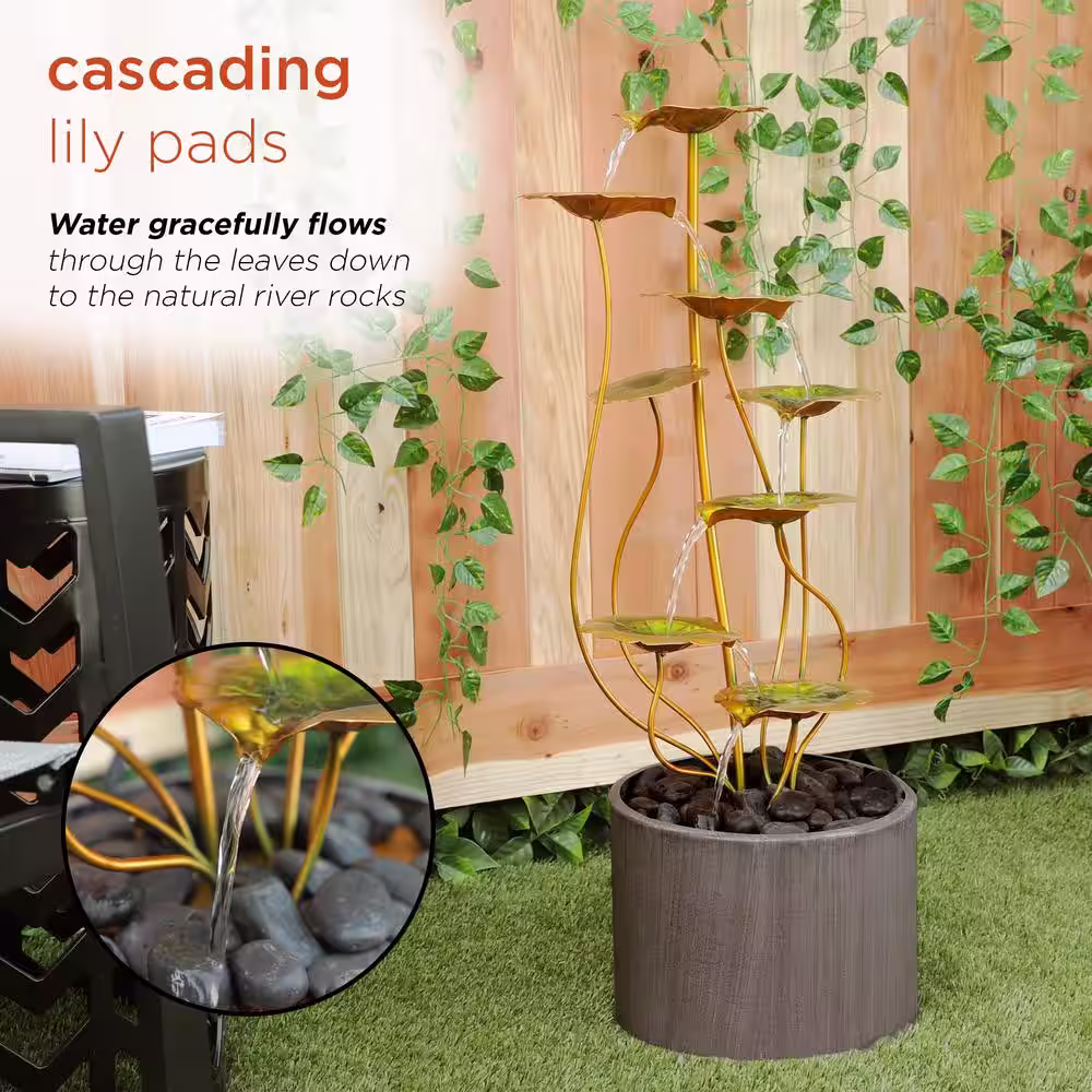 Alpine Corporation 31 in. Tall Indoor/Outdoor Multi-Tiered Lily Pads Metal Fountain with Stones