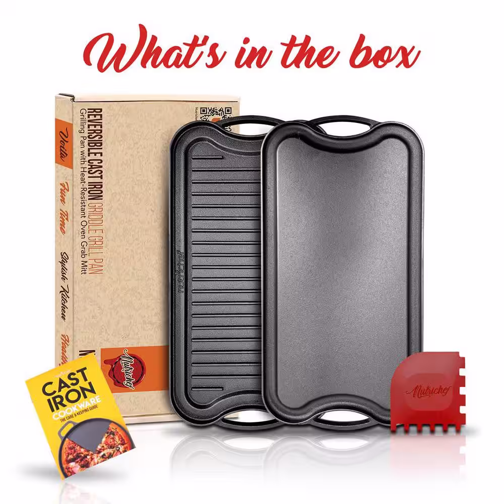 NutriChef Reversible 18 in. Cast Iron Grill Pan in Black with Heat-Resistant Oven Grab Mitt