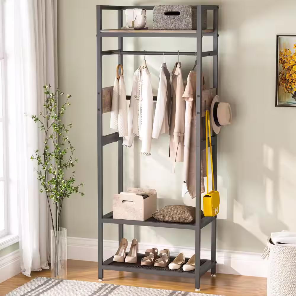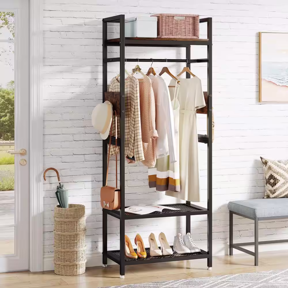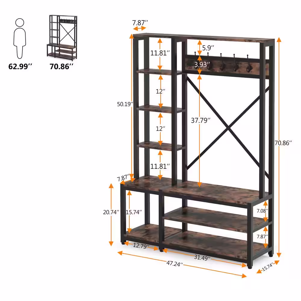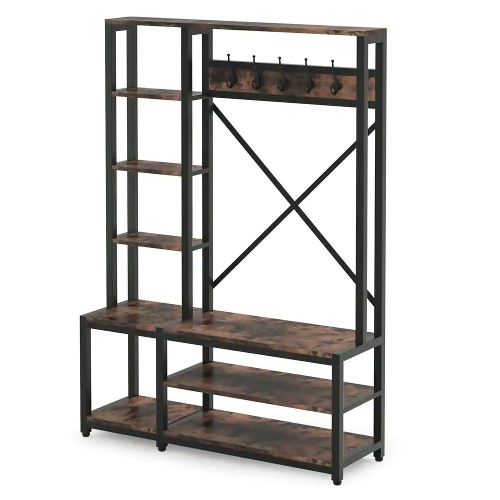 None Carmalita Brown 69.29 in. Industrial Hall Tree Entryway Coat Rack with Shoe Storage Shelf and Hooks