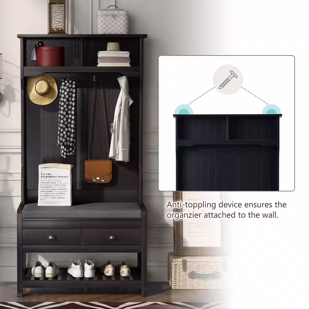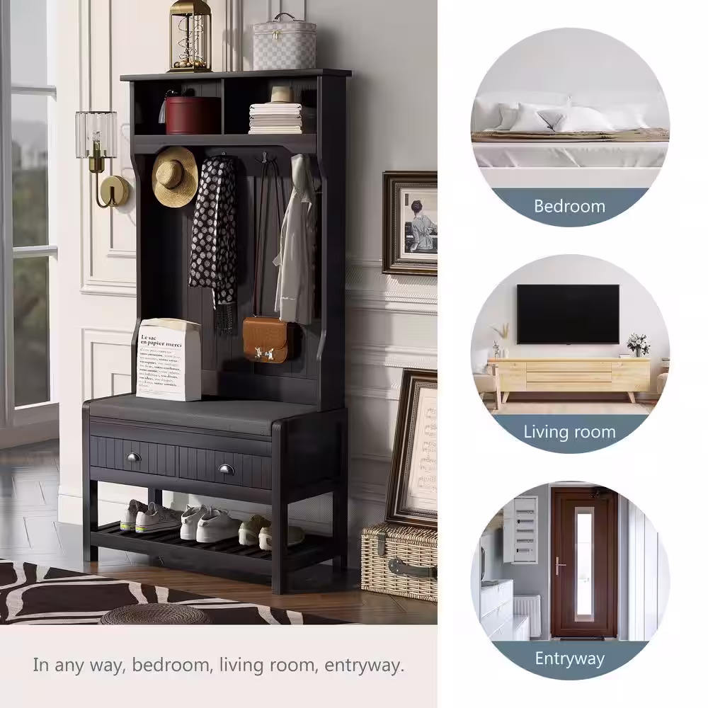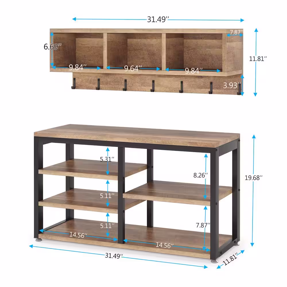 None Howard Coffee Wood 32 in. Shoe Rack with Coat Hooks, Hall Tree with Shoe Bench and Shelves