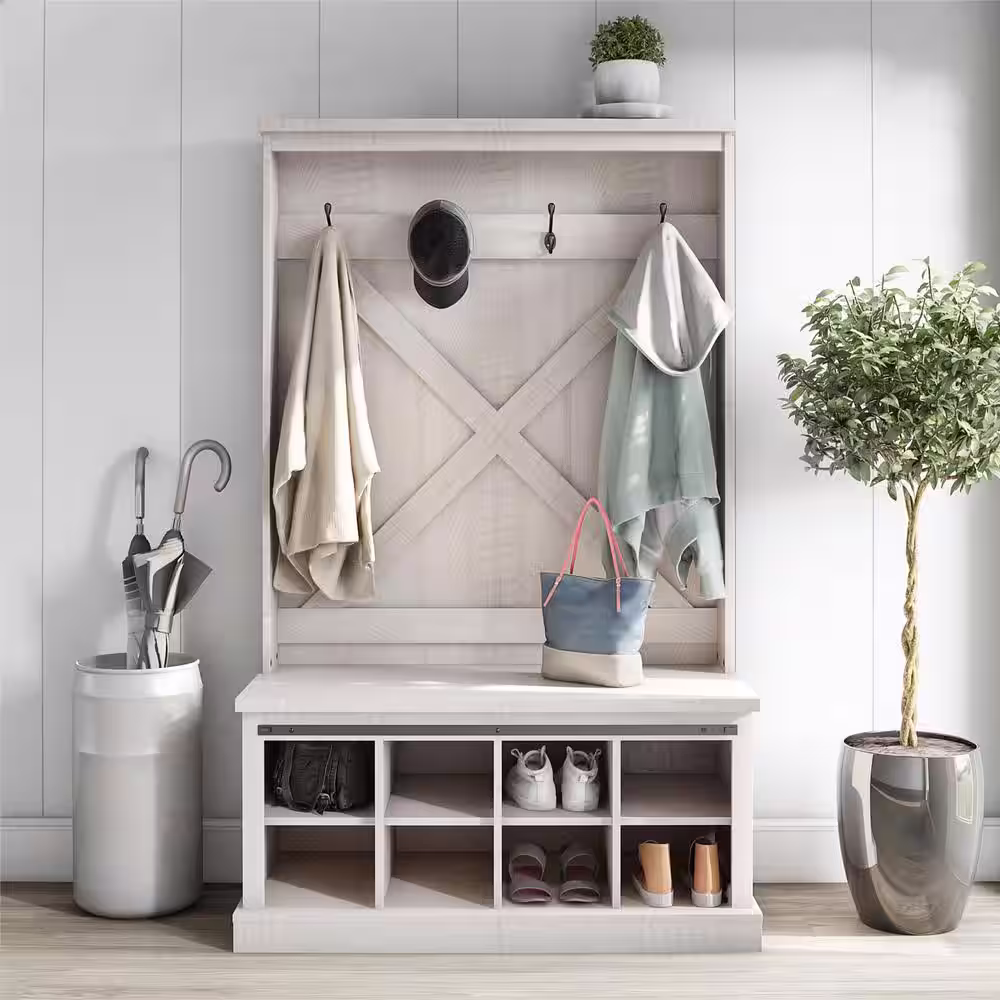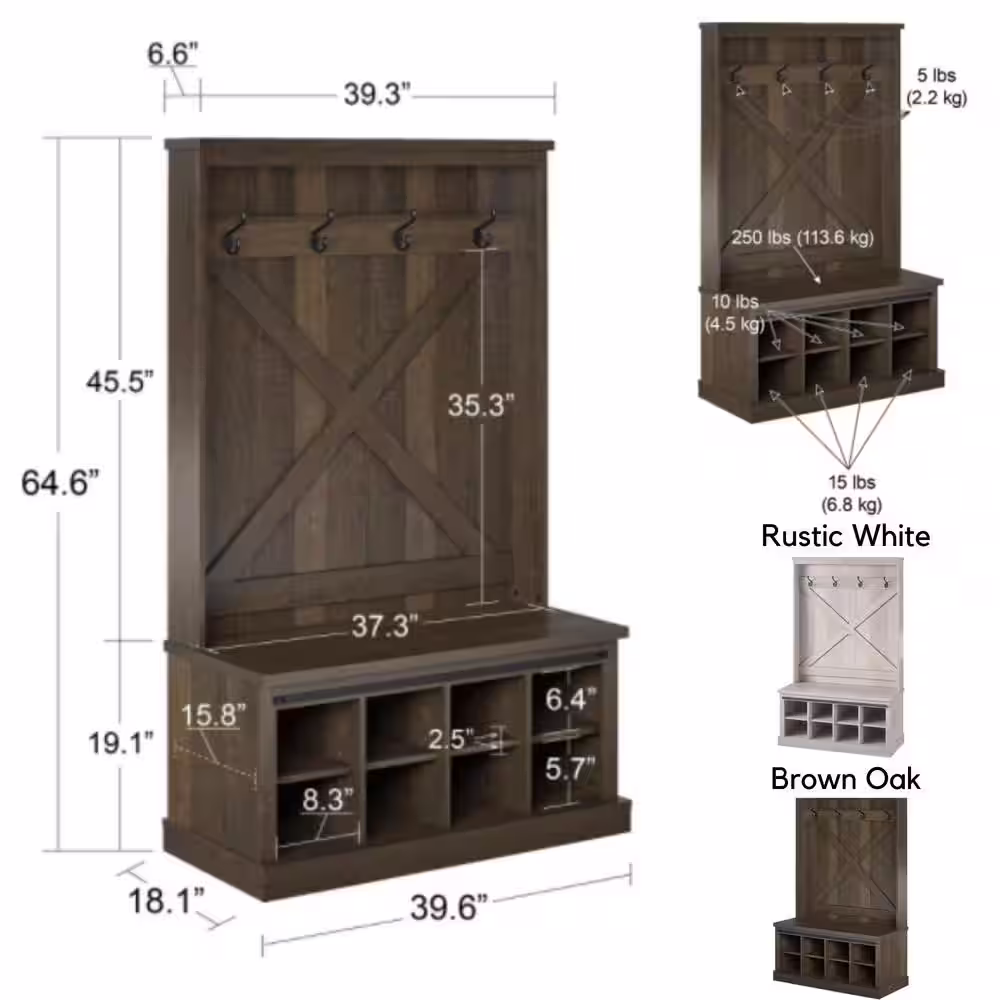 BYBLIGHT Carmalita Rustic Brown Garment Rack Hall Tree with Bench and 15 Pairs Shoes Storage Shelves