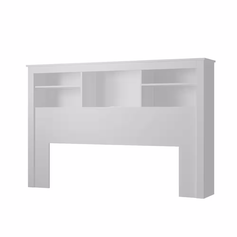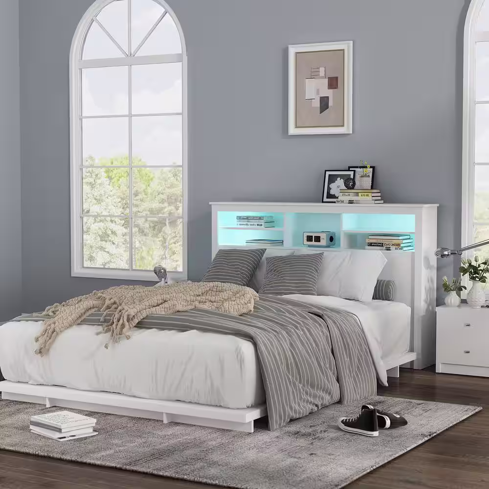 None White Full Queen Wood Headboard Shelf with Socket Adapter USB Interface, Shelves and LED Lights