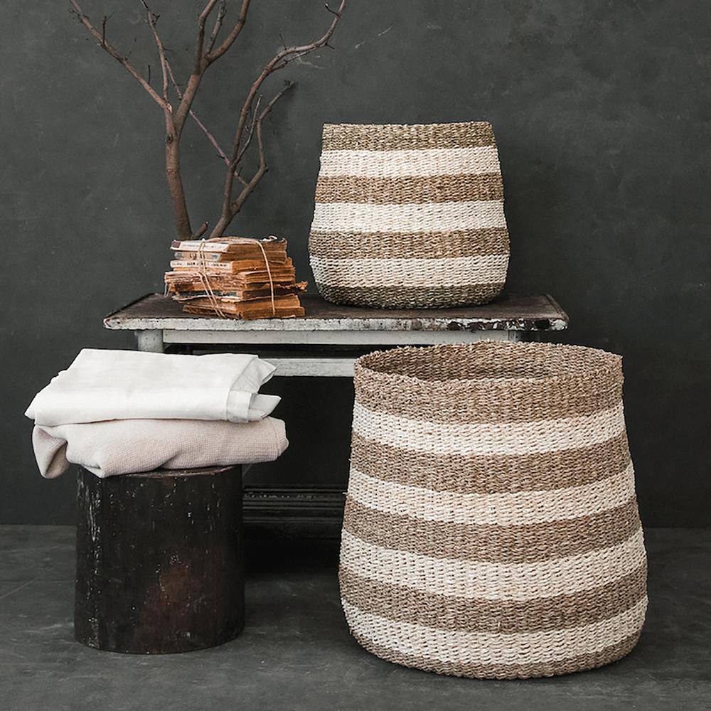Zentique Concave Hand Woven Wicker Seagrass and Palm Leaf with Light and Dark Stripes Medium Basket