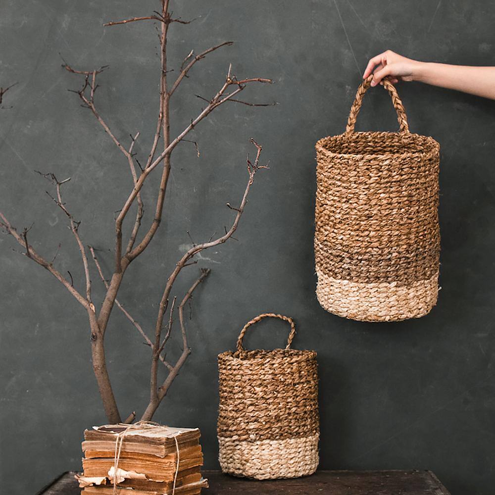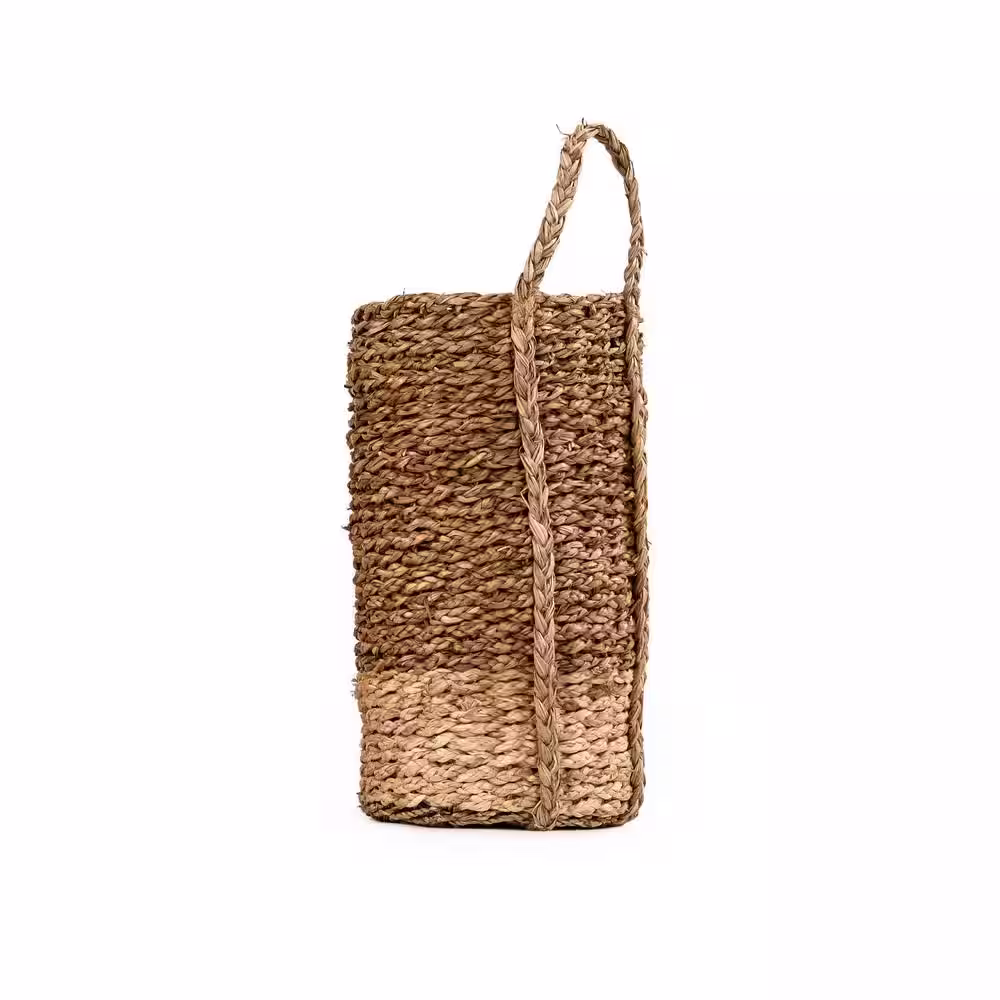 Zentique Two-toned Hand Woven Cylindrical Wicker Seagrass and Corn Husk Leaf Large Basket with Single Handle