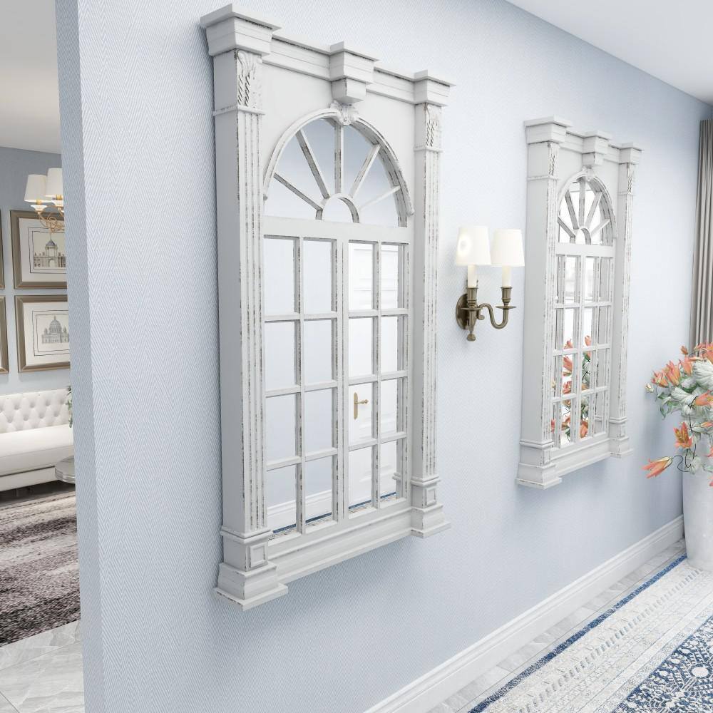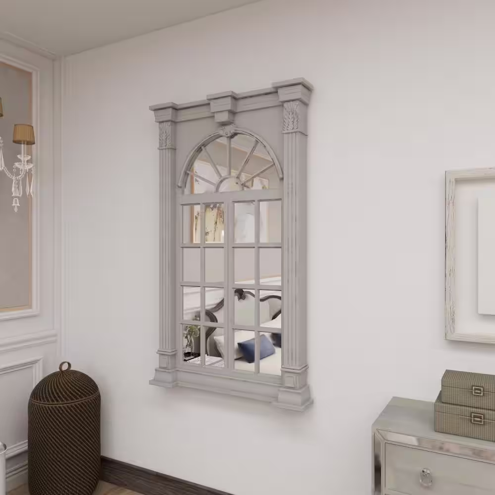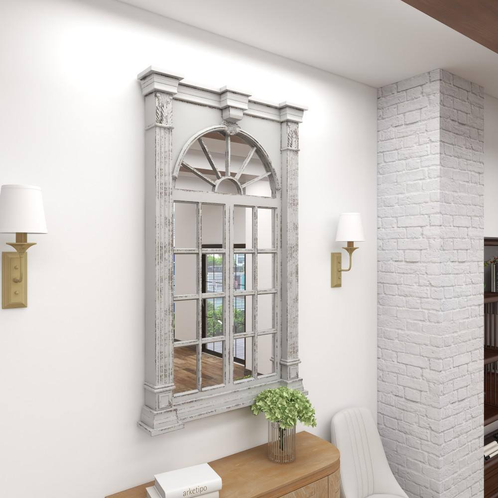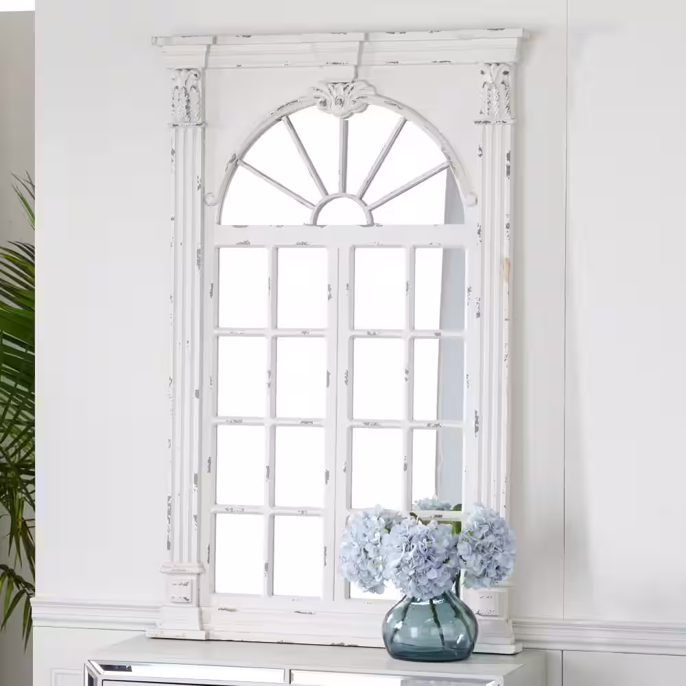 Litton Lane 52 in. x 37 in. Window Pane Inspired Rectangle Framed Cream Wall Mirror with Arched Top and Distressing