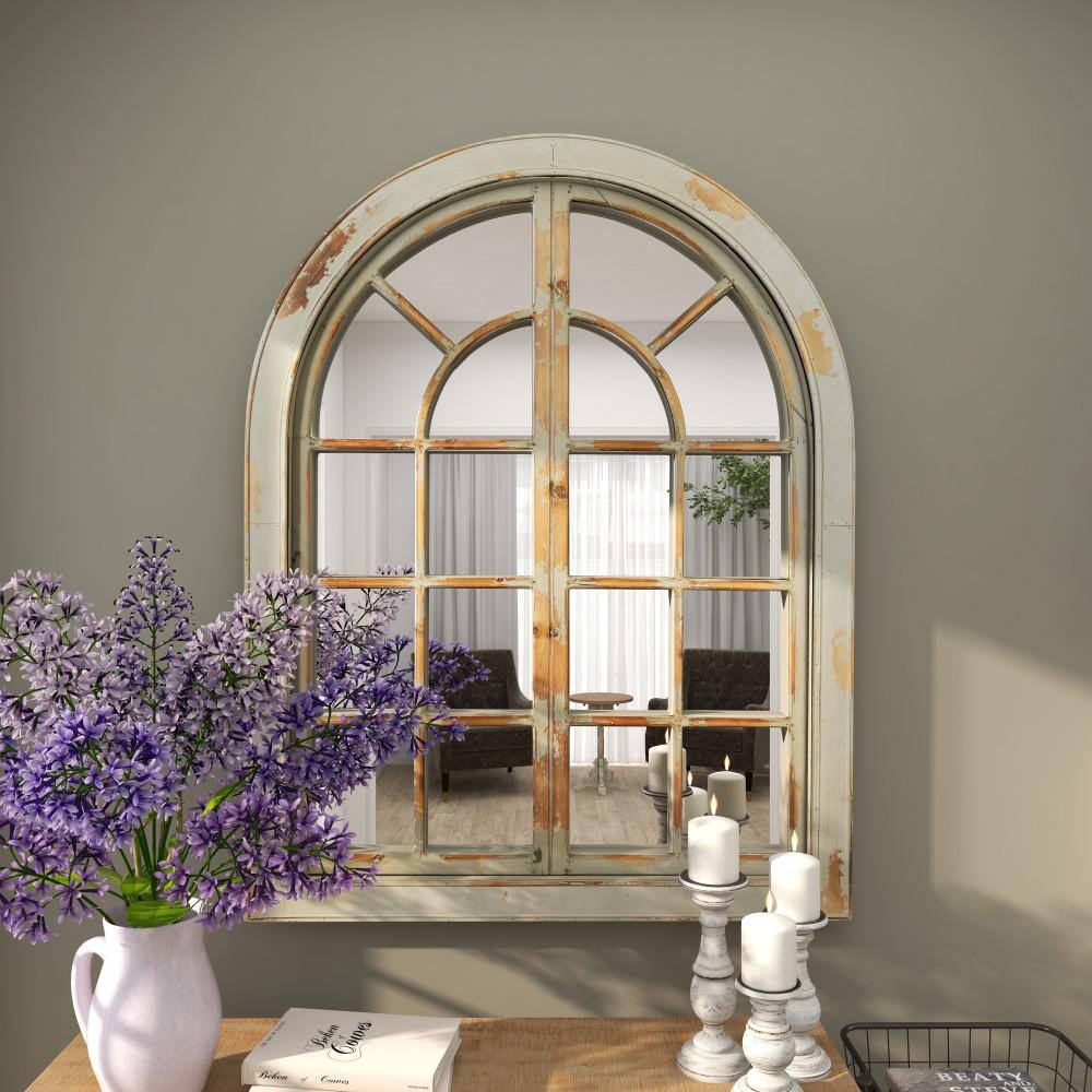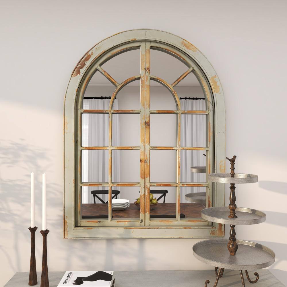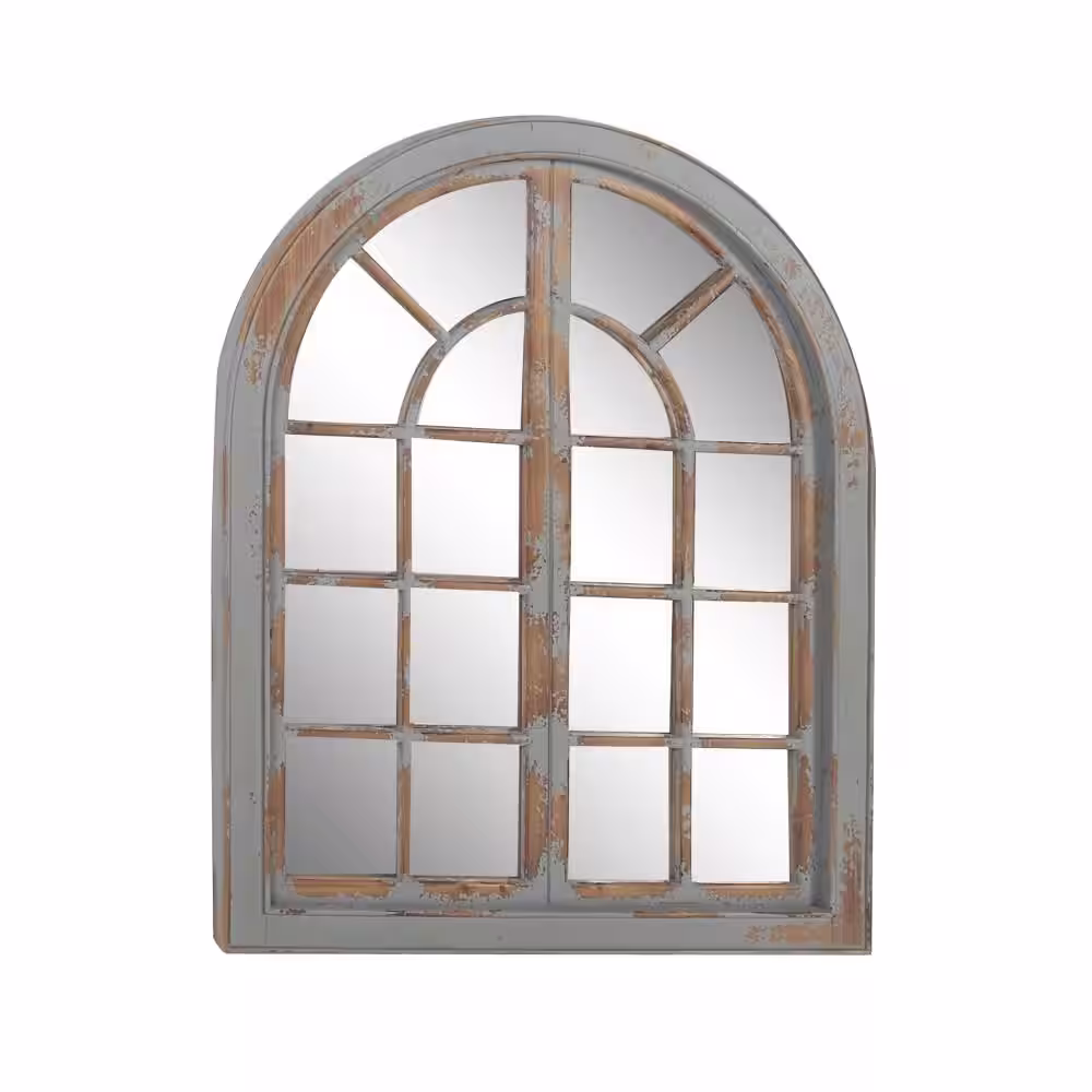 Litton Lane 48 in. x 37 in. Window Pane Inspired Arched Framed Gray Wall Mirror with Arched Top and Distressing