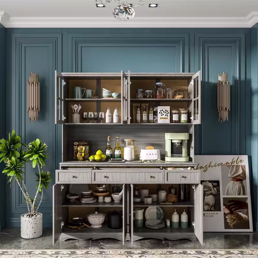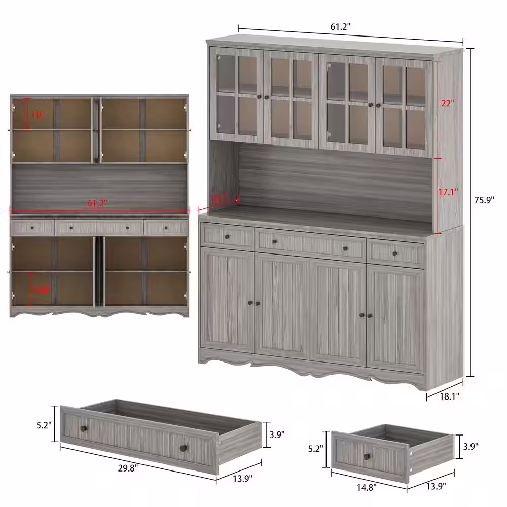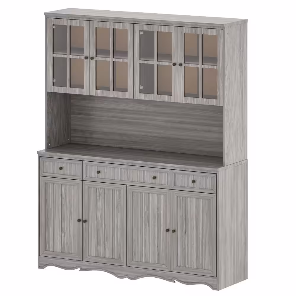 None Gray Retro Style Wood Accent Storage Cabinet with 3-Drawer, Tempered Glass Doors and Adjustable Shelves