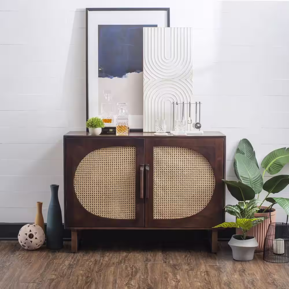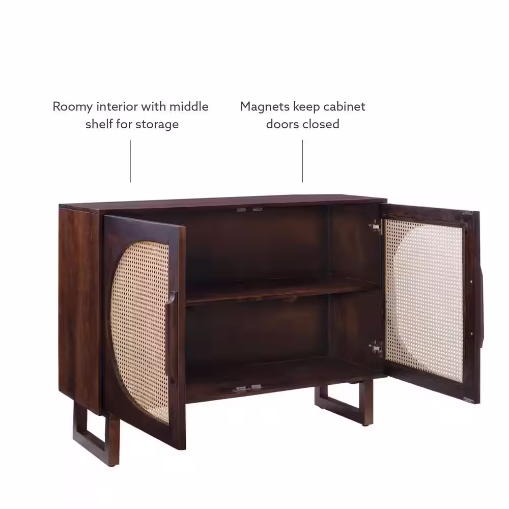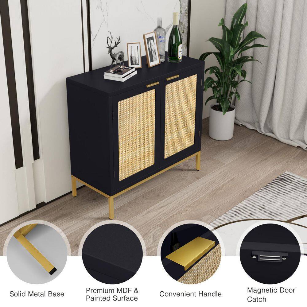 Aupodin Black Accent Storage Cabinet with 2 Rattan Doors Mid Century Sideboard Furniture for Living Room Bedroom