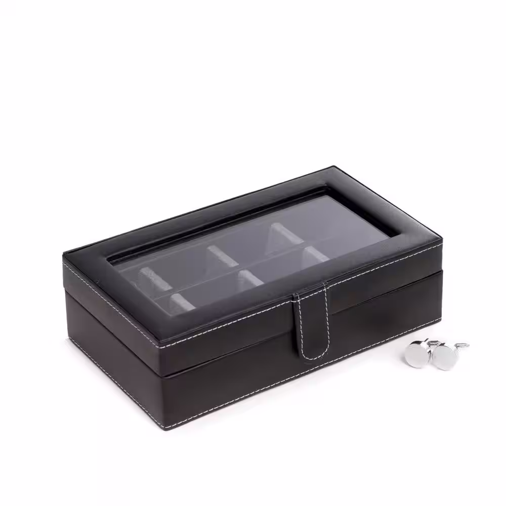 BEY-BERK Black Leather Stacked Valet for 6-Watches and 20-Cufflinks with Lid