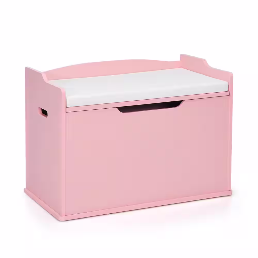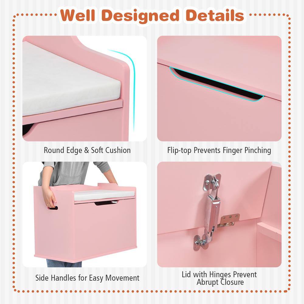 Costway Pink Kids Toy Box Wooden Flip-top Storage Chest Bench with Cushion Safety Hinge