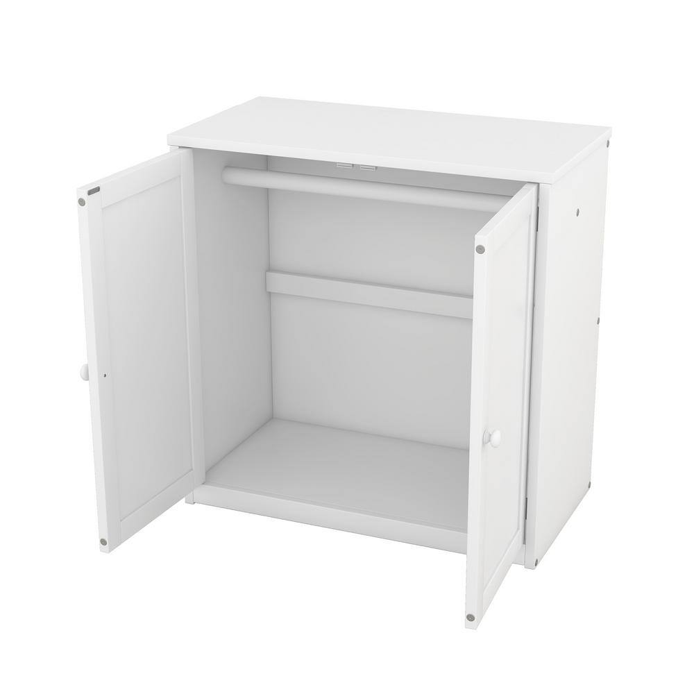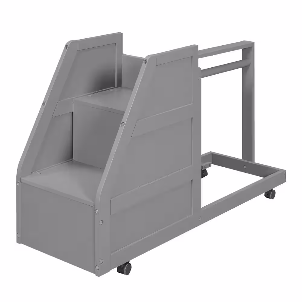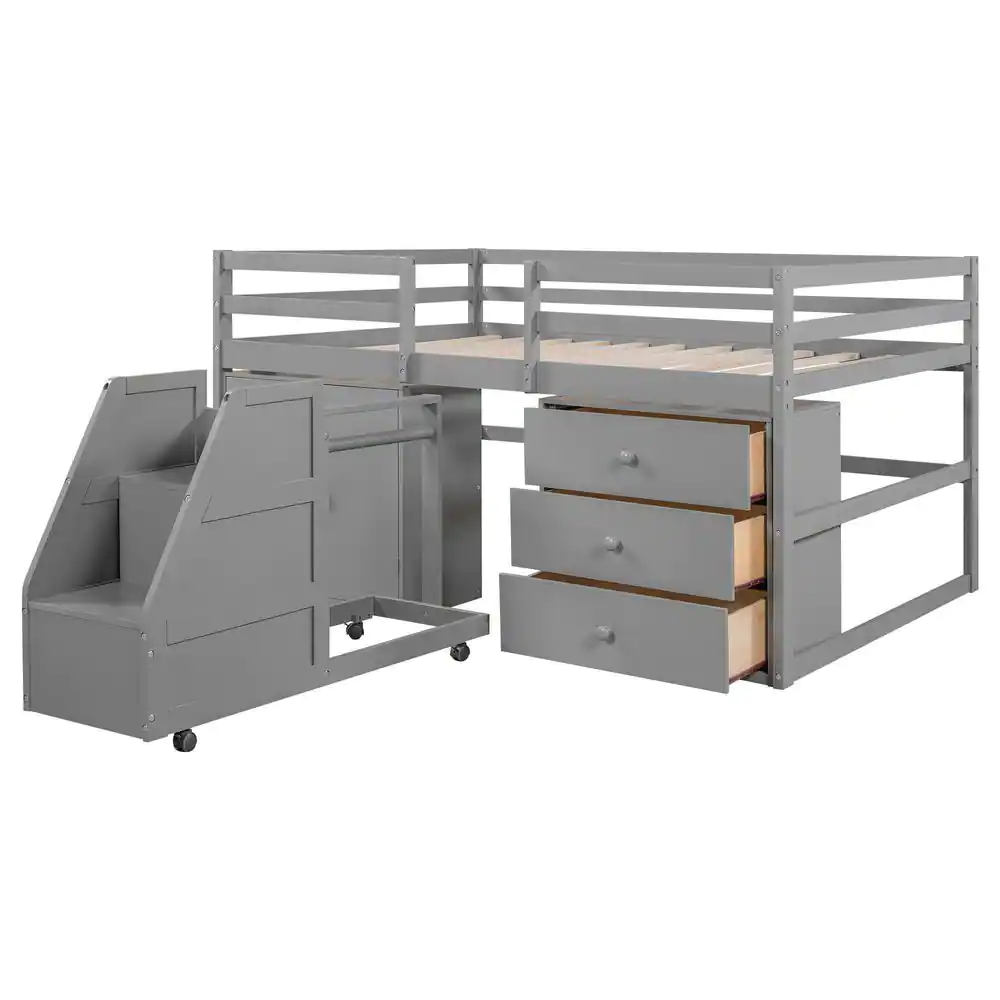 None Gray Wood Full Size Low Loft Bed with Cabinets and Drawers, Hanging Clothes At The Back Of The Staircase