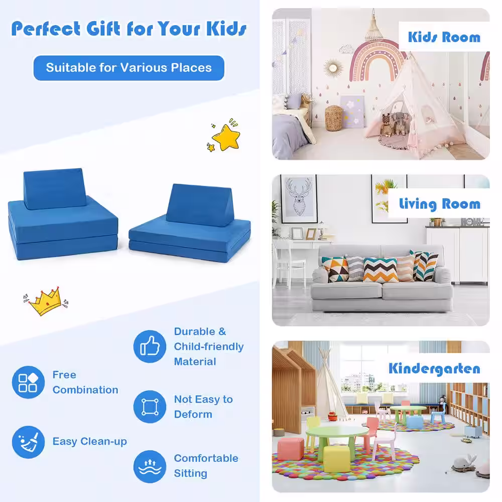 Costway 4-Piece Blue Convertible Kids Couch or 2-Chairs Toddler to Teen Sofa and Play Set