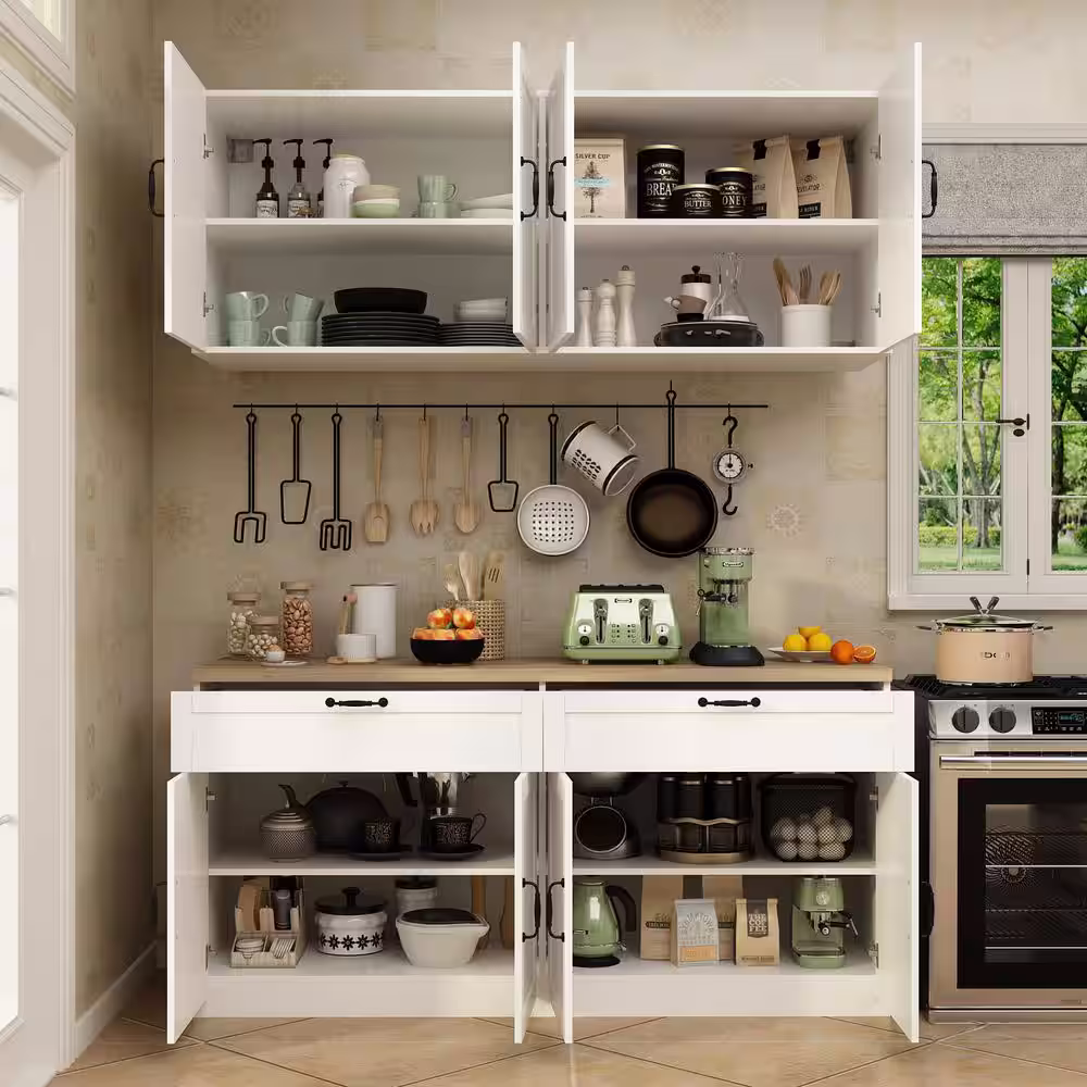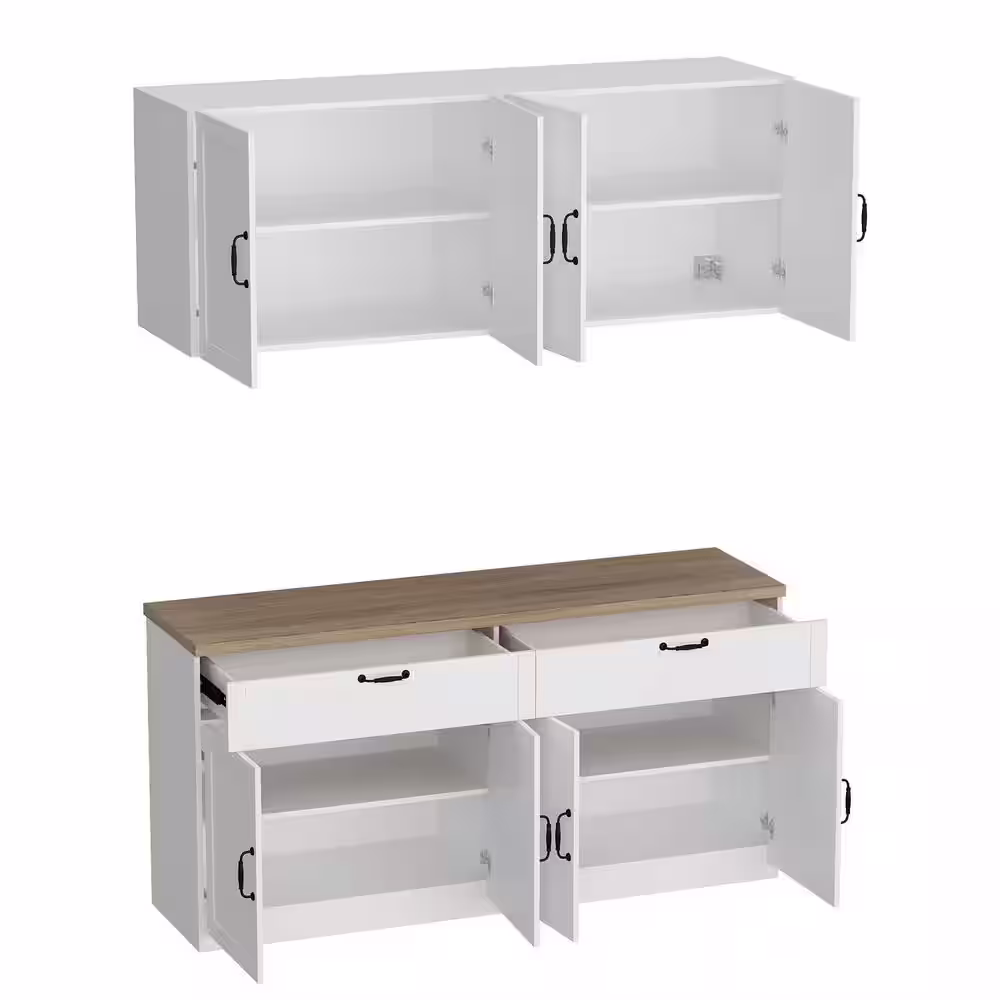 None White Wooden Sideboard, Storage Cabinet, with Wall Mounted Kitchen Cabinet( Two Parts )