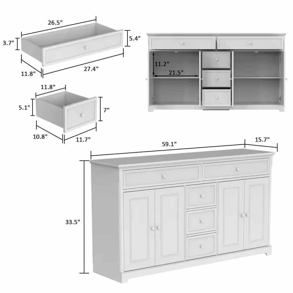 None White Wooden Sideboard with 2 Large Drawers, 3 Small Drawers and 2 Cabinets 59.1 in. W 33.5 in. H x 15.7 in. D