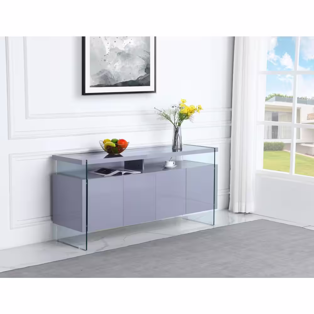 None Carly High Gloss Light Gray Wood Top 62 in. Wide Sideboard With Glass Legs