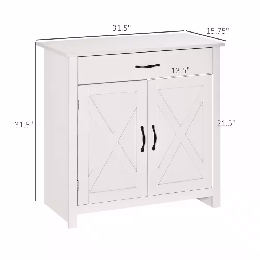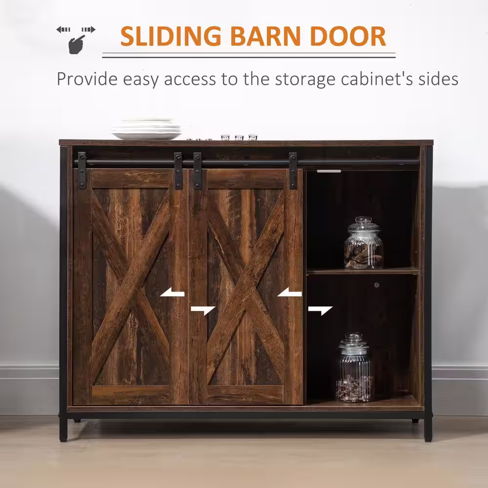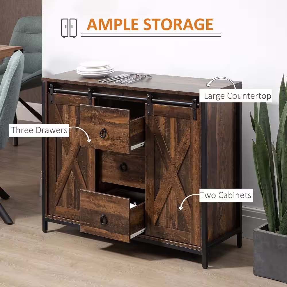 HOMCOM Industrial Farmhouse Rustic Brown Kitchen Sideboard with Sliding Barn Doors, 3-Drawers and Adjustable Shelves