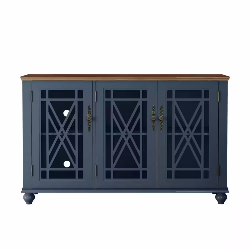 None Vintage Navy MDF 55 in. Storage Buffet Sideboard with Floral Design Doors