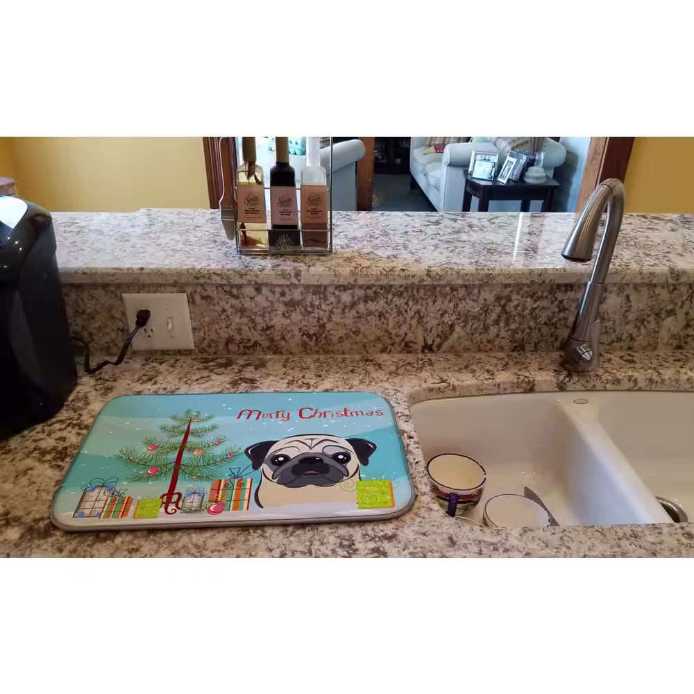 Caroline's Treasures 14 in. x 21 in. Multicolor Christmas Tree and Fawn Pug Dish Drying Mat