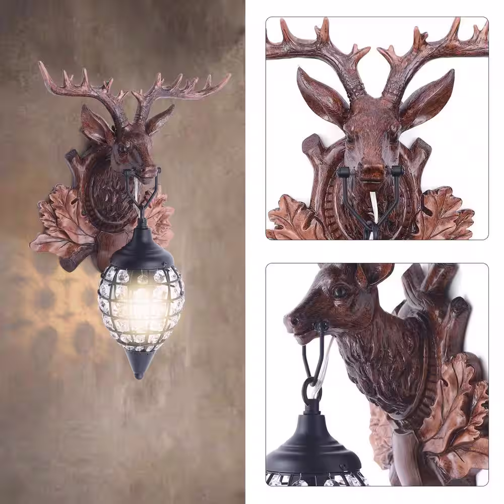 None 11.8 in. 1-Light Brown Retro Crystal Antler Wall Sconce with Clear Crystal Shade, for Bedroom Hallway Entrance