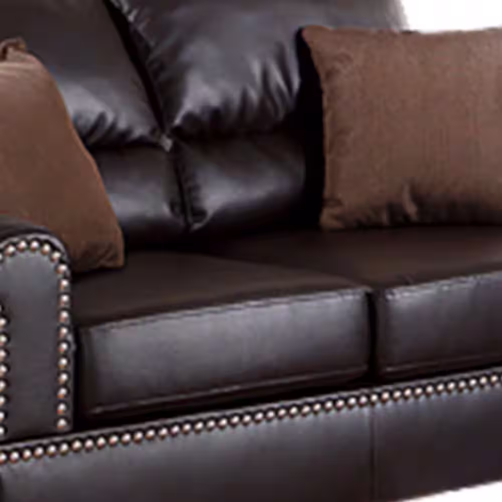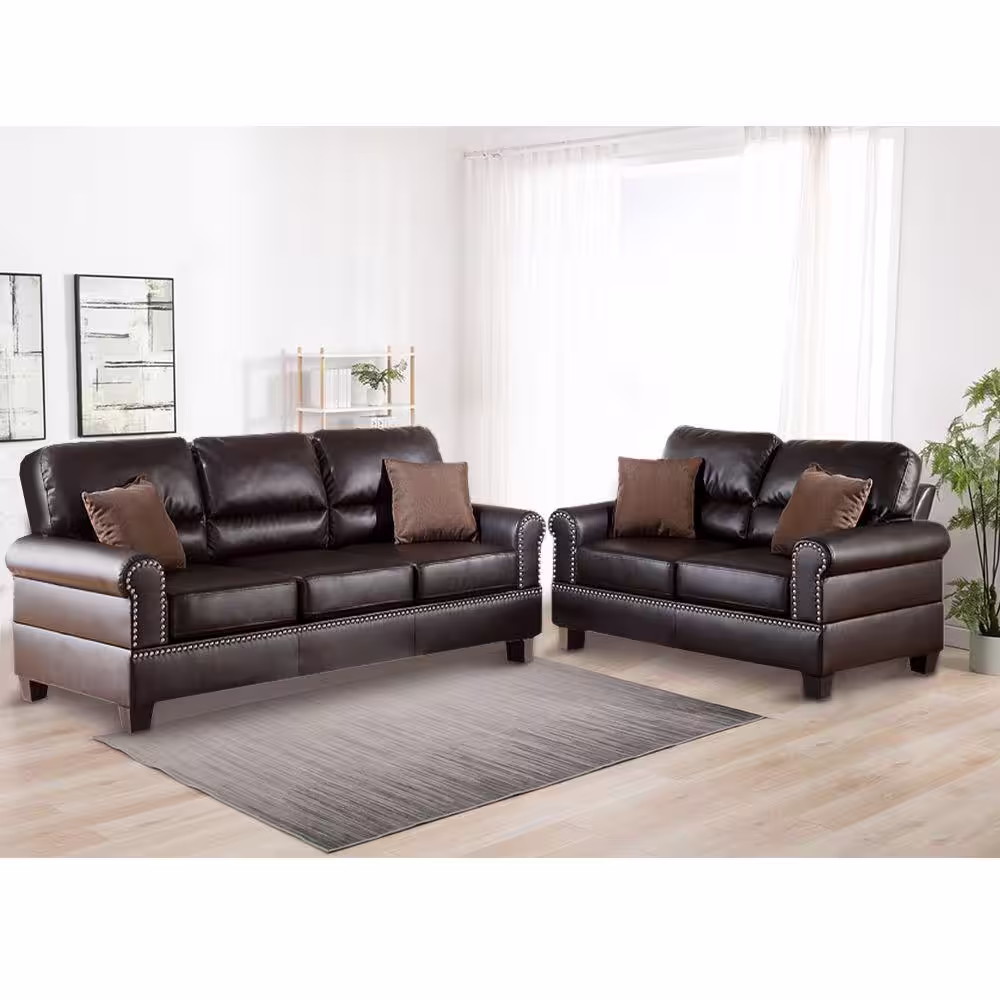 Benjara 57 in. Round Arm Bonded Leather Straight 2-Piece Sofa Set with Pillows Brown