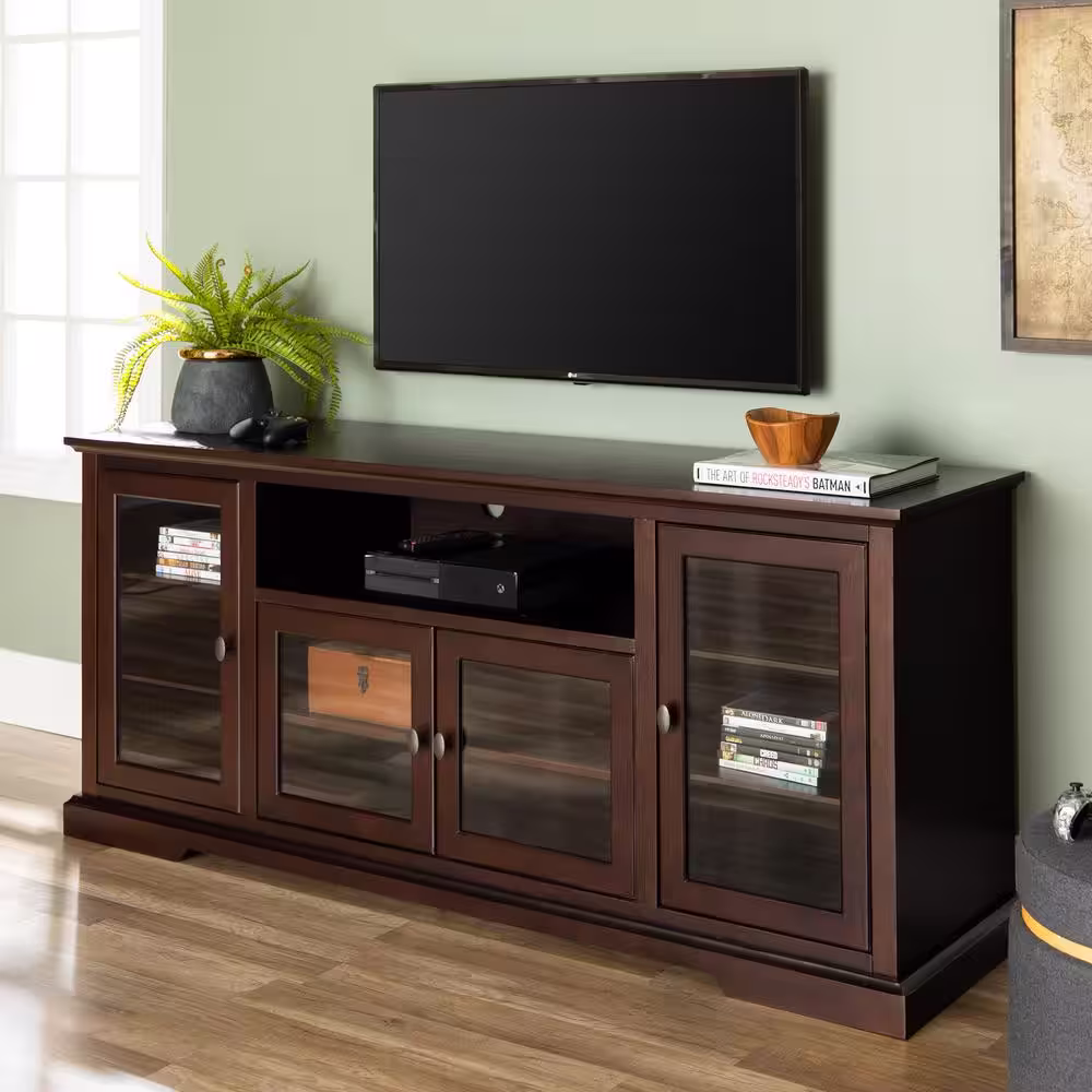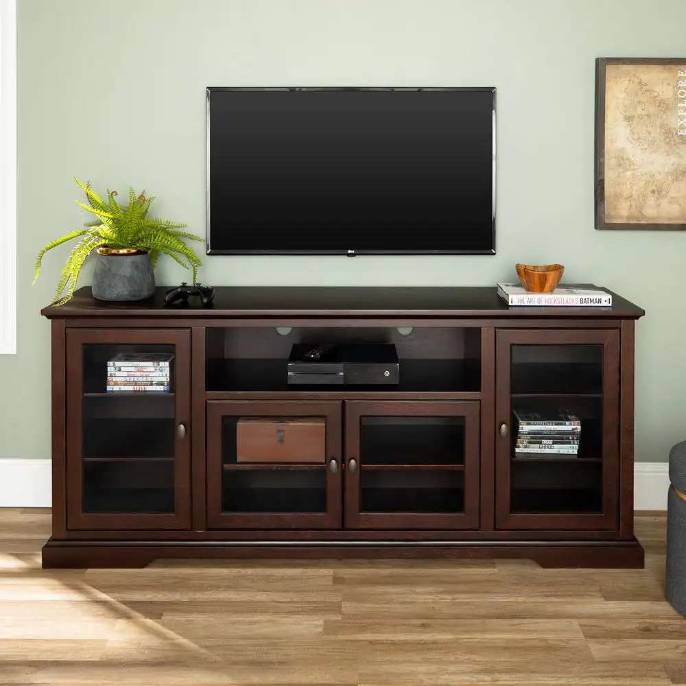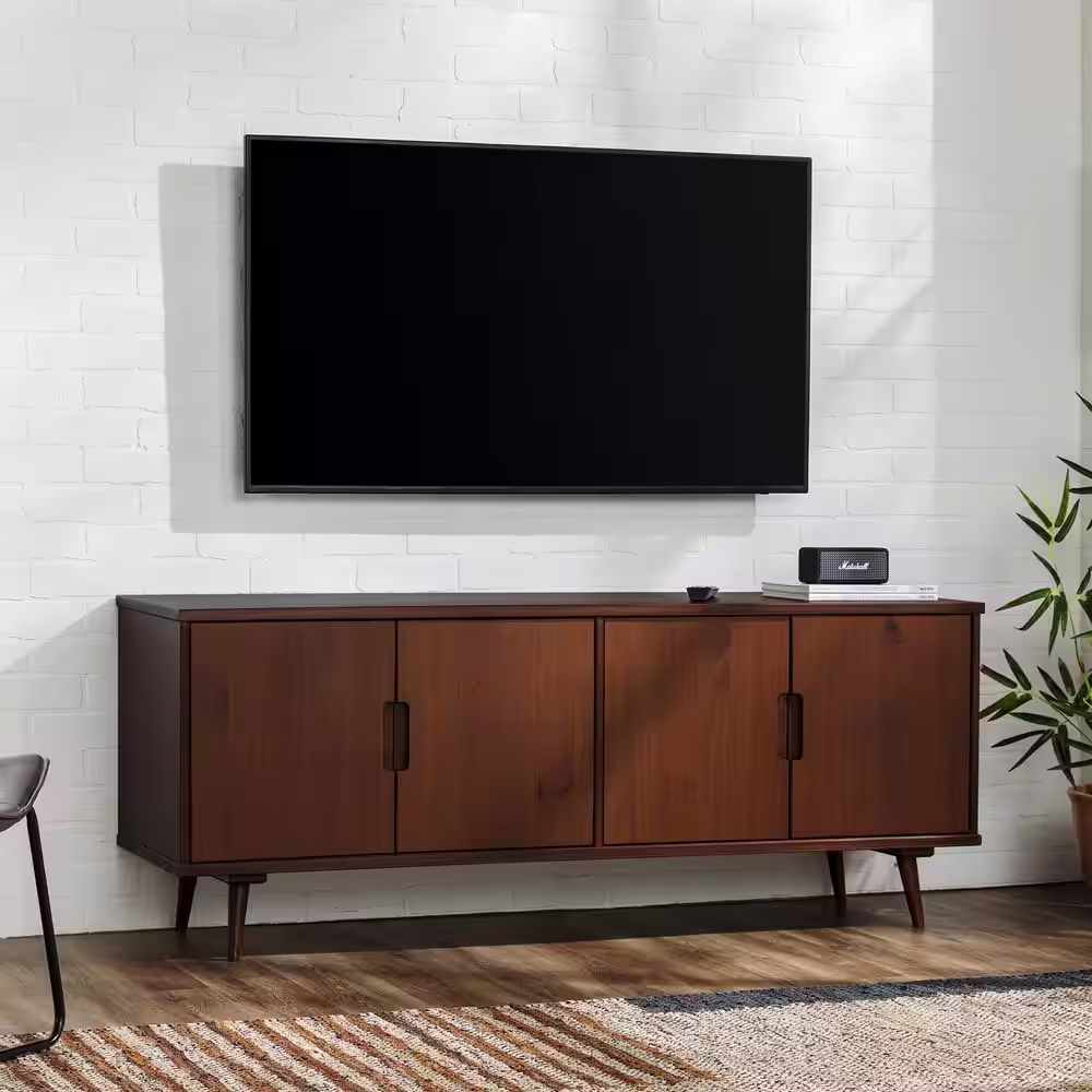 Welwick Designs 60 in. Walnut Solid Wood Mid-Century Modern TV Stand with 4-Doors Fits TVs up to 65 in.