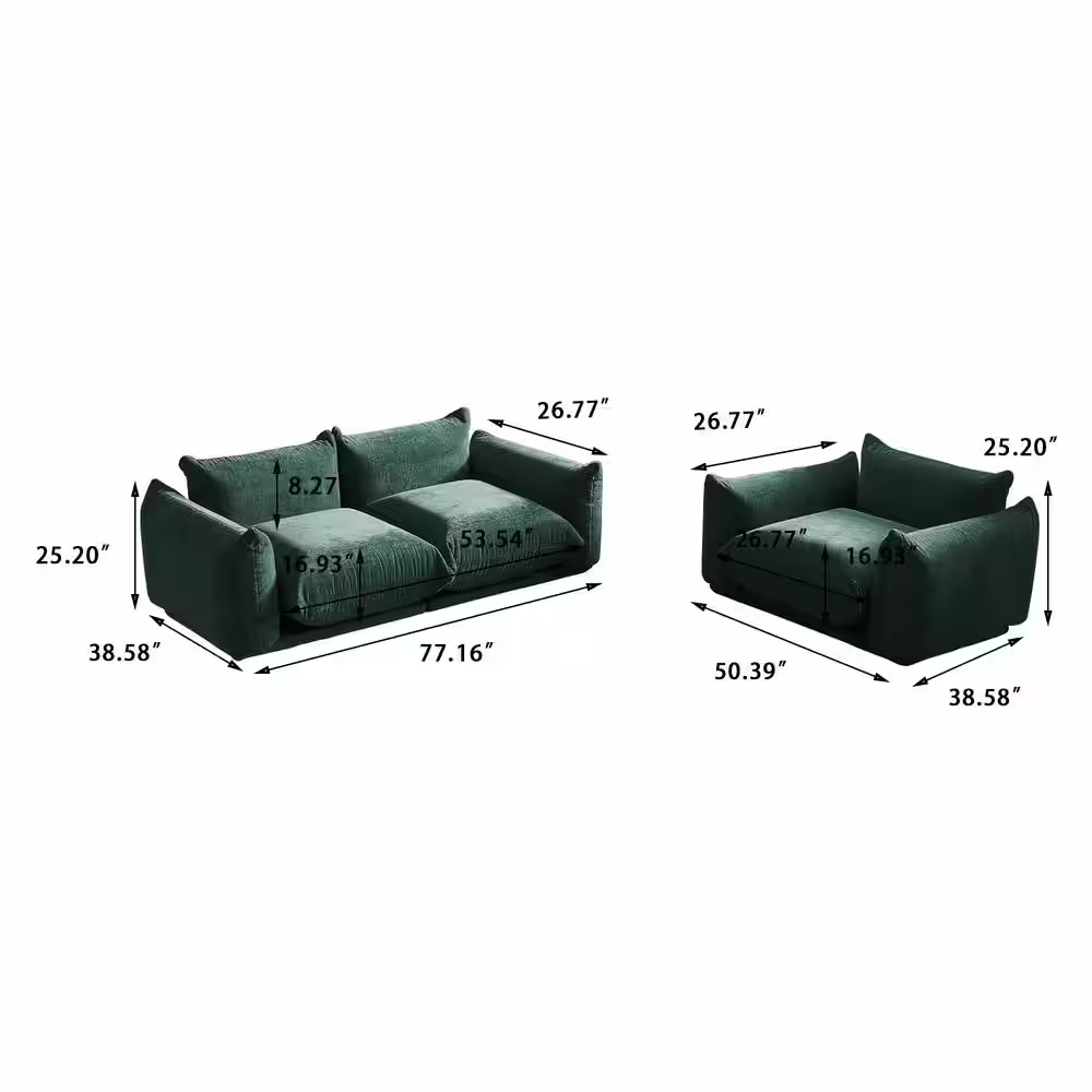 None 2-Pieces Flared Arm Wide Square Shape Chenille Top Green Sofa Couch Living Room Set (1-Seat Plus 2-Seats)