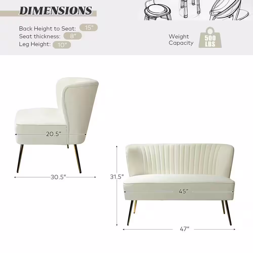 JAYDEN CREATION Carmita 47 in. Ivory Golden Base Velvet Tufted 2-Seats Loveseats Sofa