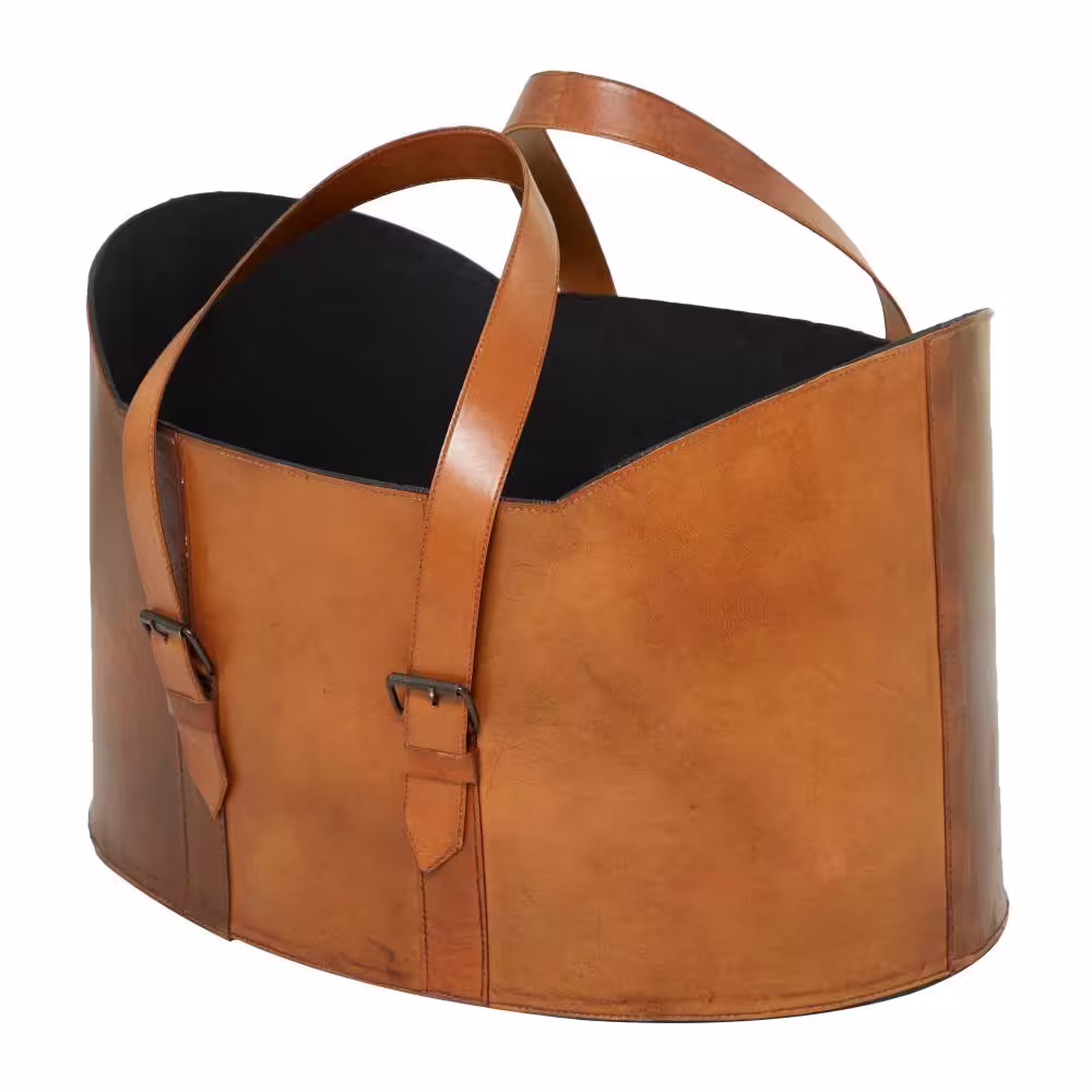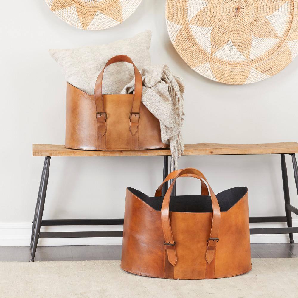 None Brown Handmade Box Style Standing Magazine Holder with Detail Stitching and Curved Handles (Set of 2)