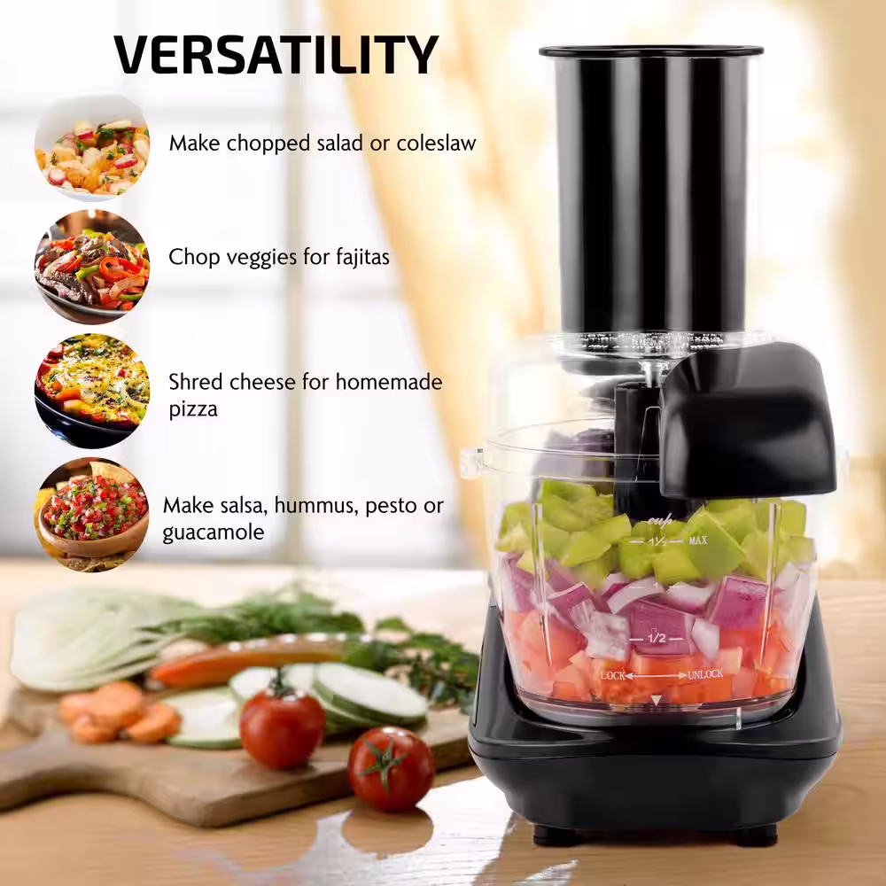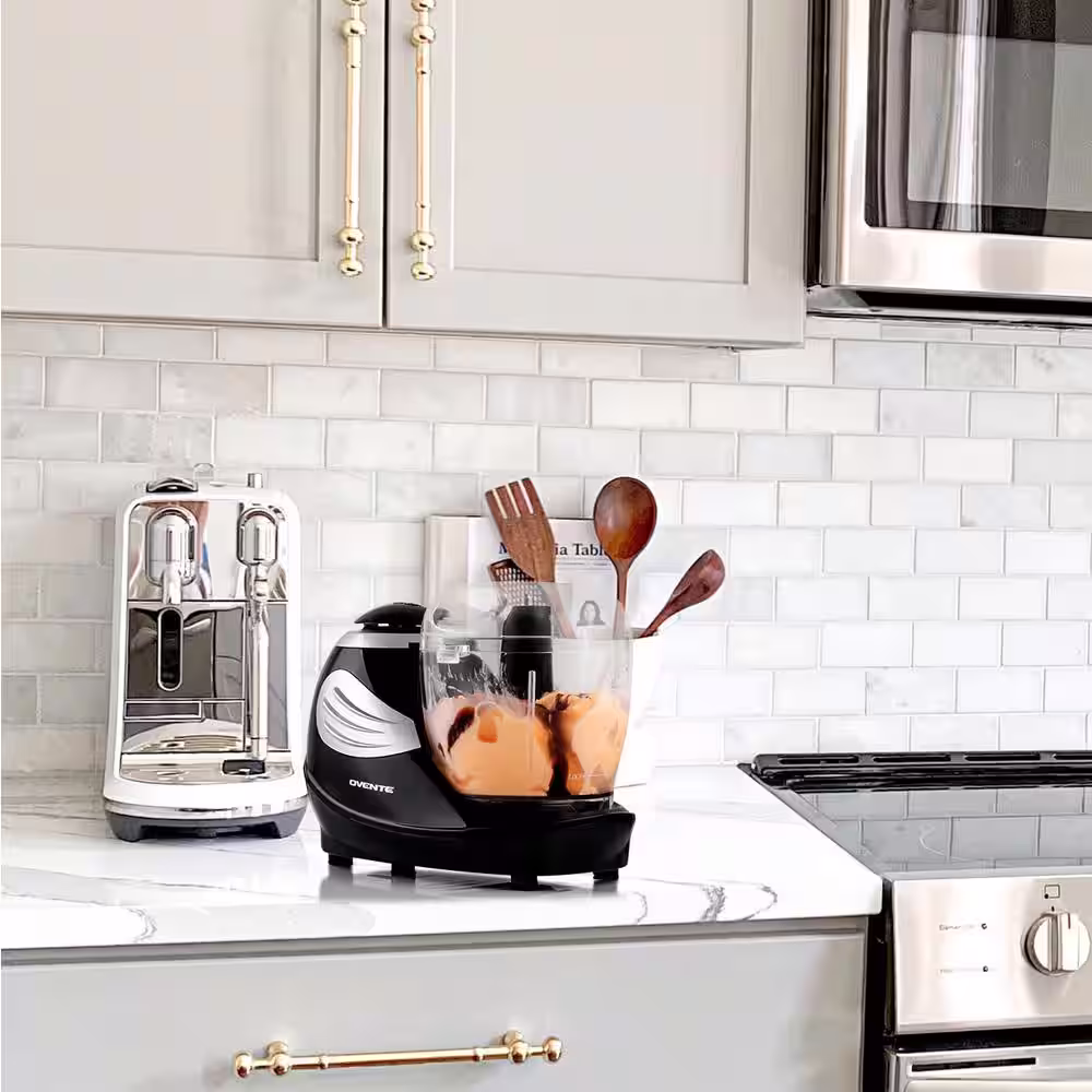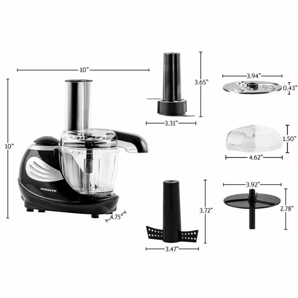 OVENTE 1.5-Cup Single Speed Black Mini Food Processor Chopping Blade, Mixer, Shredding/Slicing Disc