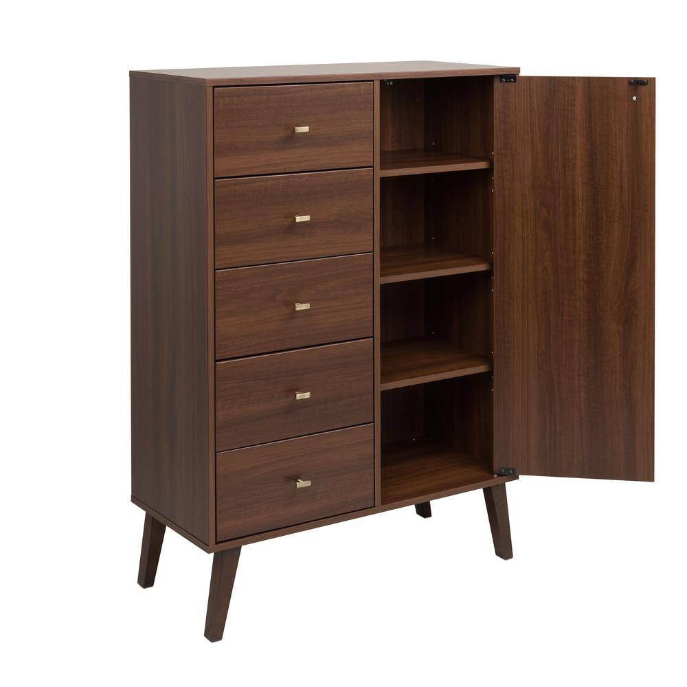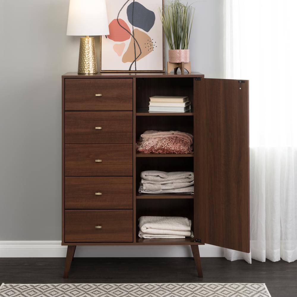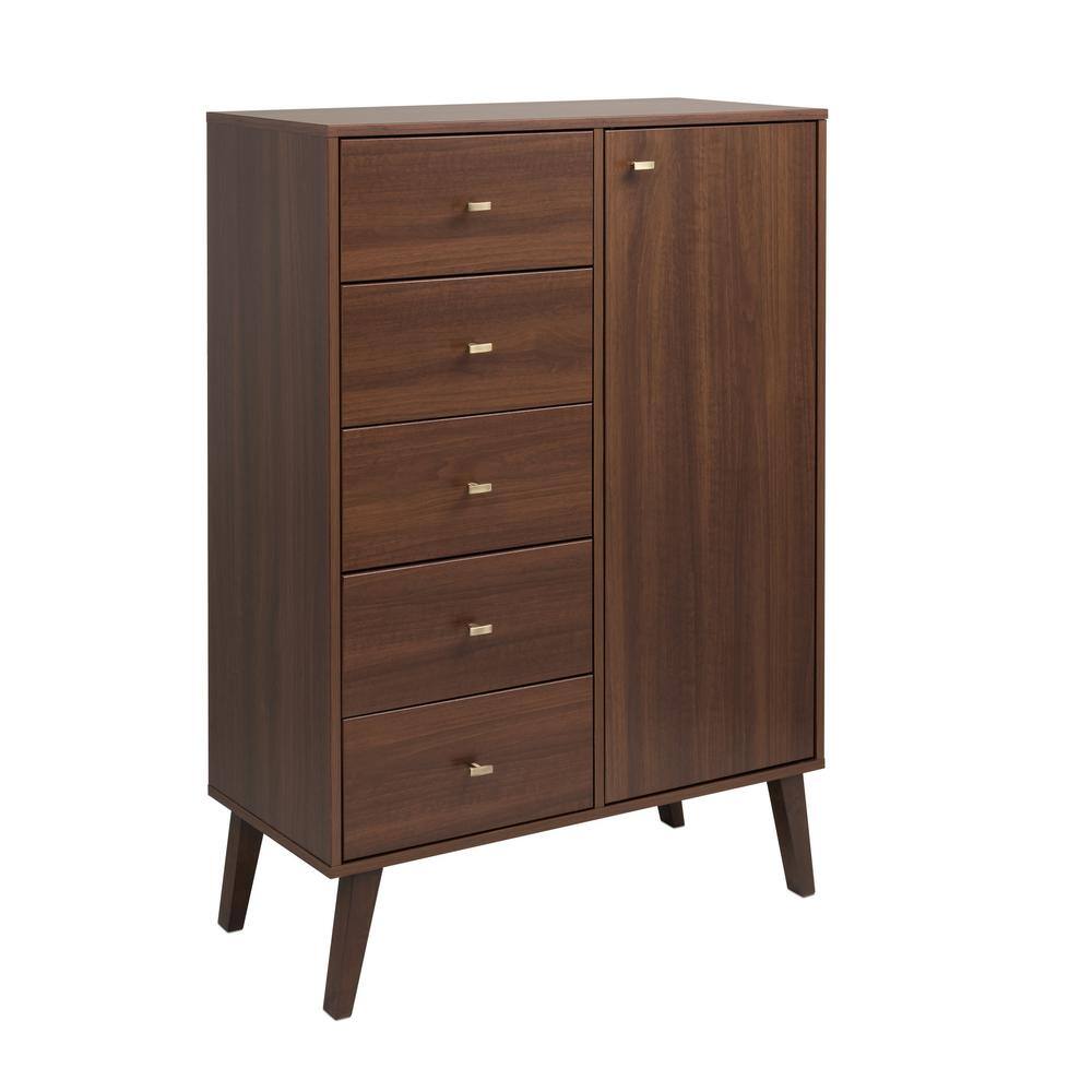 Prepac Milo 5-Drawer Cherry Mid-Century Modern Chest with Door 34.5 in W. x 49 in H. x 16 in. D