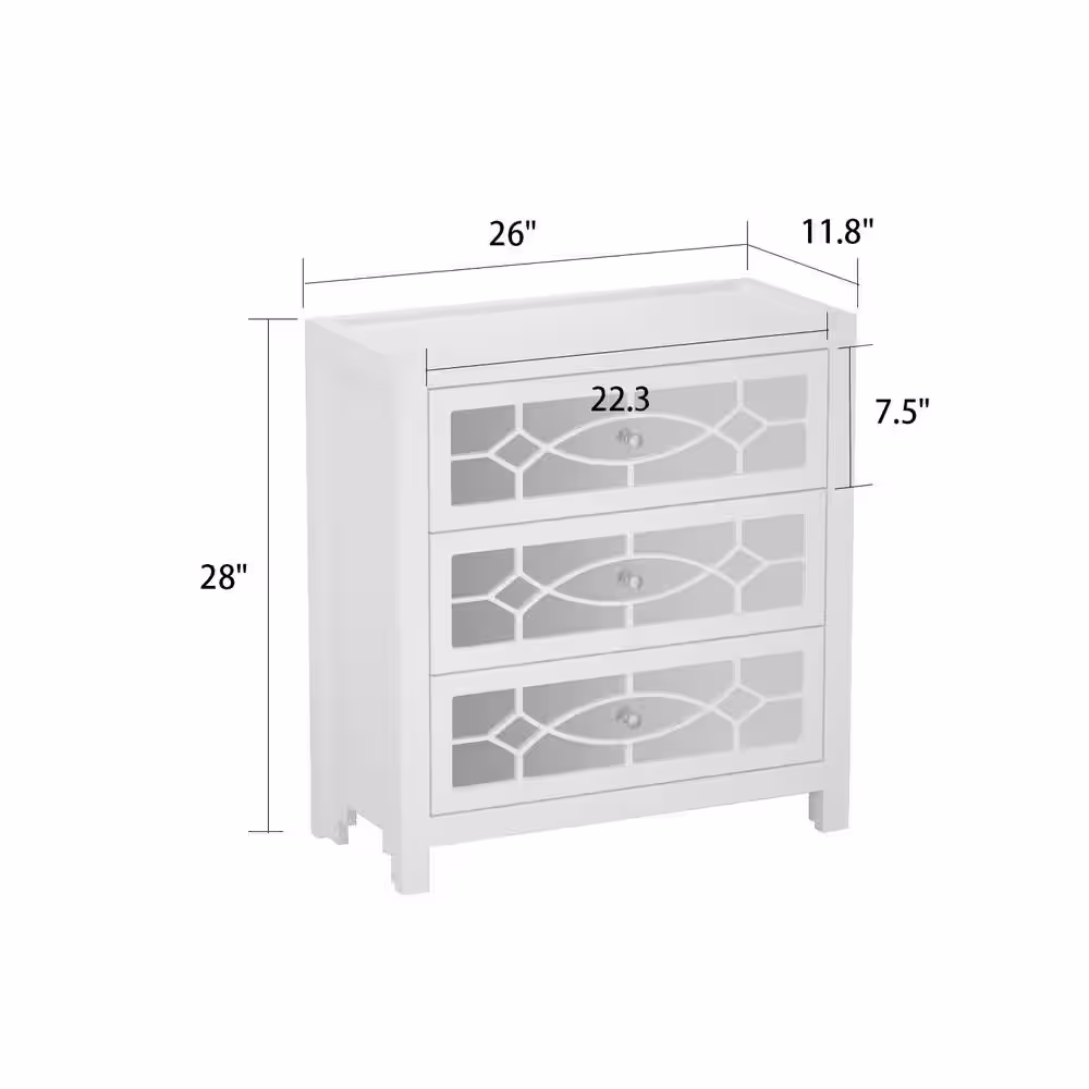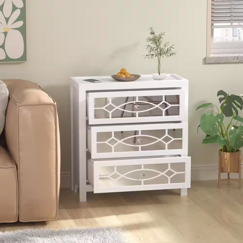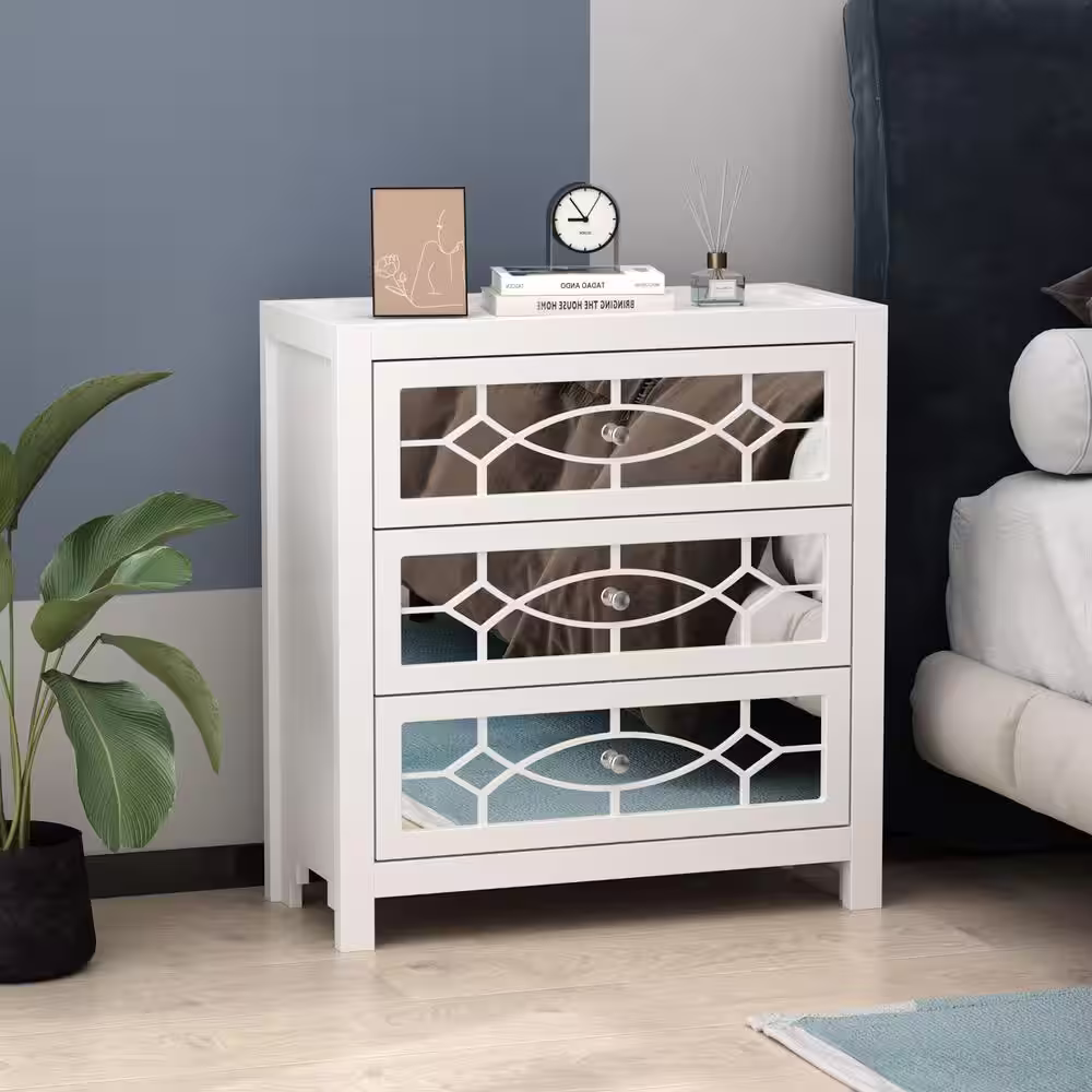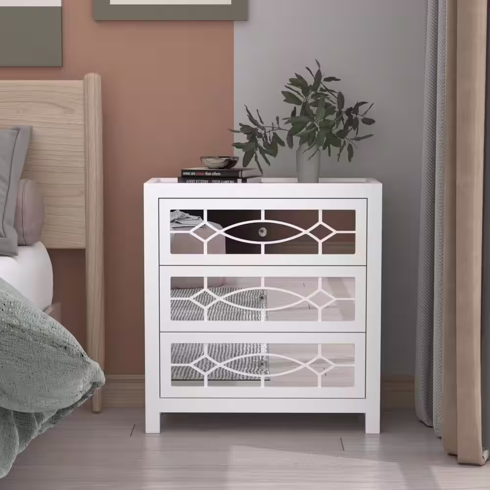 None 3-Mirrored Drawers White Wood Nightstands Bedside Table With Mirror Finish 11.8 in. D x 26 in. W x 28 in. H