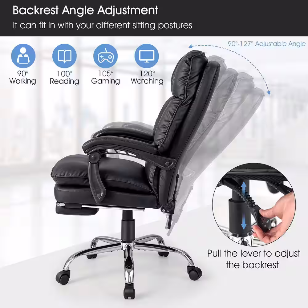 None Faux Leather High Back Reclining Office Chair Ergonomic Computer Desk Chair in Black with Footrest and Pad