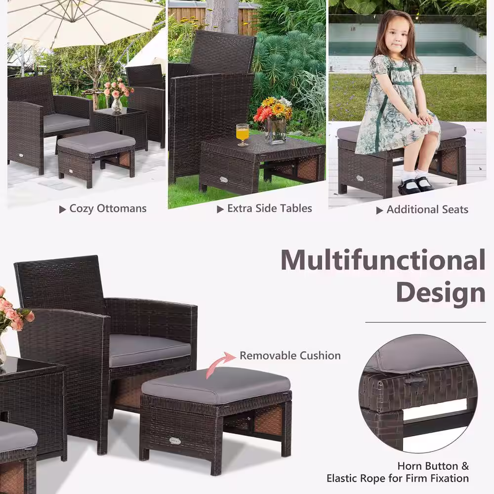 Costway 5-Piece Patio Rattan Furniture Set Chair Ottoman Cushion Space Saving with Cover Gray